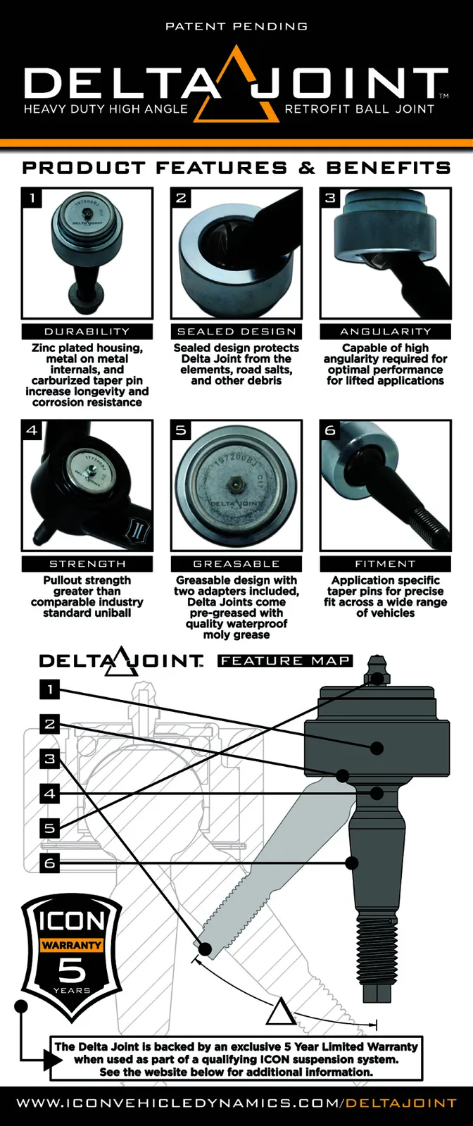 These upper control arms feature ICON's patented Delta Joint. The Delta Joint is a heavy duty high angle ball joint that combines the durability of a ball joint with the performance characteristics of a traditional uniball. While the industry standard uniball does a great job of allowing the control arms of a vehicle to articulate with little bind, they do have an inherent weakness that leaves more to be desired when used in a daily driven application - exposure to the elements. The Delta Joint features a zinc plated housing providing the first layer of corrosion resistance, while a tough grease seal keeps potentially harmful elements out of the inner workings of the joint. Metal on metal construction and a greasable design increase the longevity of the Delta Joint while at the same time allowing for noise-free operation. What makes the Delta Joint unique is that it brings the best of both worlds to ICON upper control arms with features that make it more robust than a uniball, and at the same time capable of greater angularity than a typical ball joint.