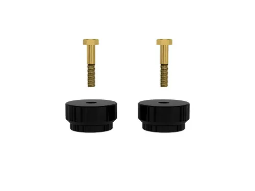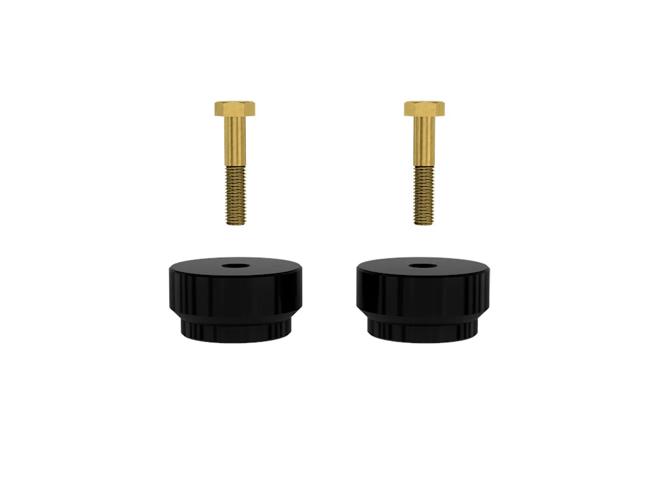 ICON Vehicle Dynamics bump stop spacers are an easy and clean looking way to lower the front bump stops on a 2005-2024 Ford Super Duty. These CNC machined aluminum spacers lower the bump stop 1 and limit suspension travel to allow for fitment of steering stabilizer kits, other aftermarket suspension parts, or even just to prevent rub from oversized tires.