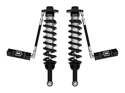 ICON Vehicle Dynamics V.S. Series 2.5 coilover shocks are an incredible upgrade for the front end of 2021-2023 Ford F-150 4WD trucks. ICONs Vehicle-specific valving provides a sport tuned feel on and off-road while 2.75-3.5 of lift height adjustability allows the use of larger, more aggressive wheel and tire combinations. The larger 2.5 shock body and increased piston area over stock components provides improved damping ability and outstanding ride characteristics across varying types of terrain. Remote reservoirs ensure optimum performance by increasing the duration of consistent damping regardless of situation, keeping the shocks at a cooler operating temperature during heavy use. When paired with ICON rear 2.0 Aluminum Series or 2.5 Series shocks vehicle control will be balanced front to rear, resulting in the best overall driving experience for your F-150 truck.