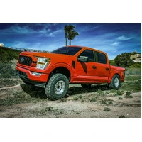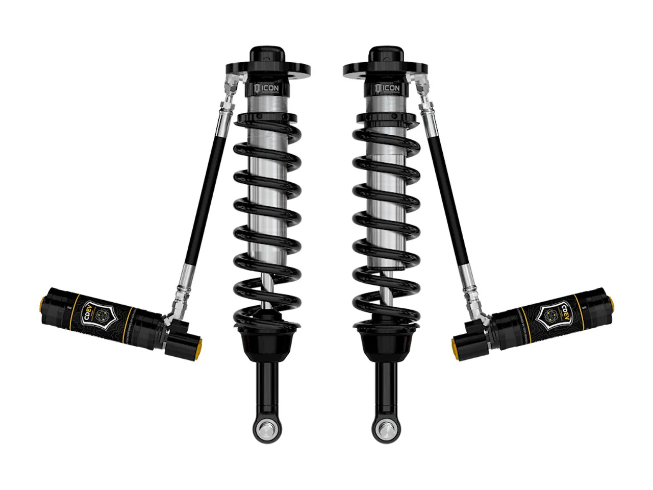 ICON Vehicle Dynamics V.S. Series 2.5 coilover shocks are an incredible upgrade for the front end of 2021-2023 Ford F-150 4WD trucks. ICONs Vehicle-specific valving provides a sport tuned feel on and off-road while 2.75-3.5 of lift height adjustability allows the use of larger, more aggressive wheel and tire combinations. The larger 2.5 shock body and increased piston area over stock components provides improved damping ability and outstanding ride characteristics across varying types of terrain. Remote reservoirs ensure optimum performance by increasing the duration of consistent damping regardless of situation, keeping the shocks at a cooler operating temperature during heavy use. The ICON CDE Valve upgrade is included for those desiring an easy way to tune the ride electronically from inside the vehicle. Compression Damping Electronic Valve (CDEV) is an electronically controlled valve that meters the flow of oil to regulate the amount of damping force that is created by the shock when compressed. This infinitely variable valve can react in less than 40ms and has the ability to make extremely precise adjustments for varying terrain. CDEVs hydraulic circuits are also custom tailored per application to create the highest resolution and dynamic range allowable for each specific vehicle. Powered by ICON Intelligent Control and proprietary ICON mobile app, the system uses information from the onboard G-force sensor and Gyroscope to perform calculations based on algorithms and user-defined settings to predict terrain and adjust shock settings via the CDEV accordingly. When paired with ICON rear 2.5 Aluminum Series CDEV shocks vehicle control will be balanced front to rear, resulting in the best overall driving experience for your F-150 truck.