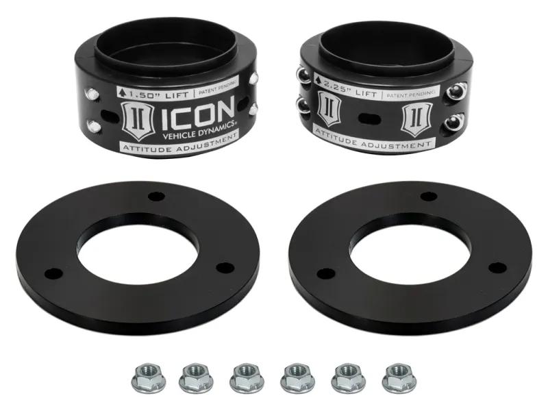 The ICON Attitude Adjustment Collar (AAC) is an industry first, patent pendingmulti-height coil spring collar that works in conjunction with atop load shim that can be configured in five unique ways to yield .5 to 2.25 of front lift height over stock.Taking the front end dimensions of the "Gen 2" Raptor into account, the collar and shim design of this leveling system achieves this range of lift height whilekeeping the OE shock in the ride zone, maintaining factory ride quality. Other options on the market achieve lift height solely through coil preload, which placesthe shock in the rebound zone at ride height and drastically impacts ride quality and performance.Installation of this leveling systemrequires no disassembly of the shock, making it a simple and straightforward process as opposed to other options currently available. CNC machined 6061 billet aluminum construction and a black anodized finish mean this product can stand up to the test of time in the harsheston and off-road conditions.Backed by ICONs limited lifetime warranty, the ICON Vehicle Dynamics Attitude Adjustment Collar is the best leveling solution on the market for the 2017-2020 Ford Raptor.