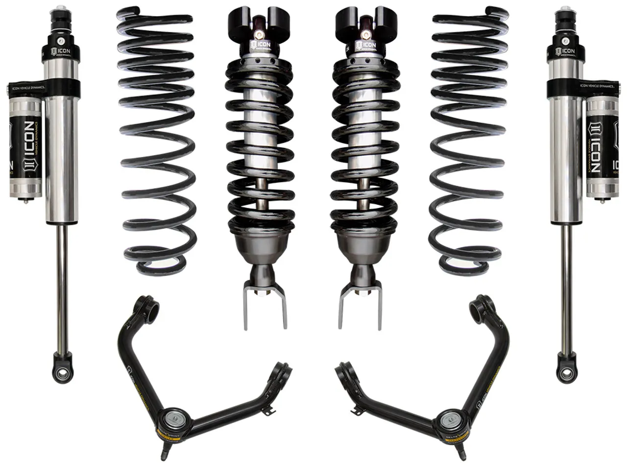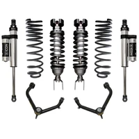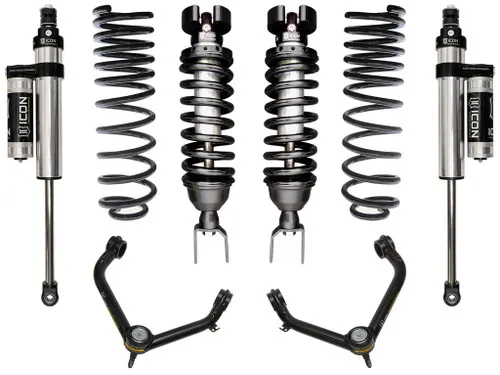This system features upper control arms with ICON's patented Delta Joint. The Delta Joint is a heavy-duty high angle ball joint that combines the durability of a ball joint with the performance characteristics of a traditional uniball. While the industry standard uniball does a great job of allowing the control arms of a vehicle to articulate with little bind, they do have an inherent weakness that leaves more to be desired when used in a daily driven application - exposure to the elements. The Delta Joint features a zinc plated housing providing the first layer of corrosion resistance, while a tough grease seal keeps potentially harmful elements out of the inner workings of the joint. Metal on metal construction and a greaseable design increase the longevity of the Delta Joint while at the same time allowing for noise-free operation. What makes the Delta Joint unique is that it brings the best of both worlds to ICON upper control arms with features that make it more robust than a uniball, and at the same time capable of greater angularity than a typical ball joint.