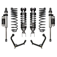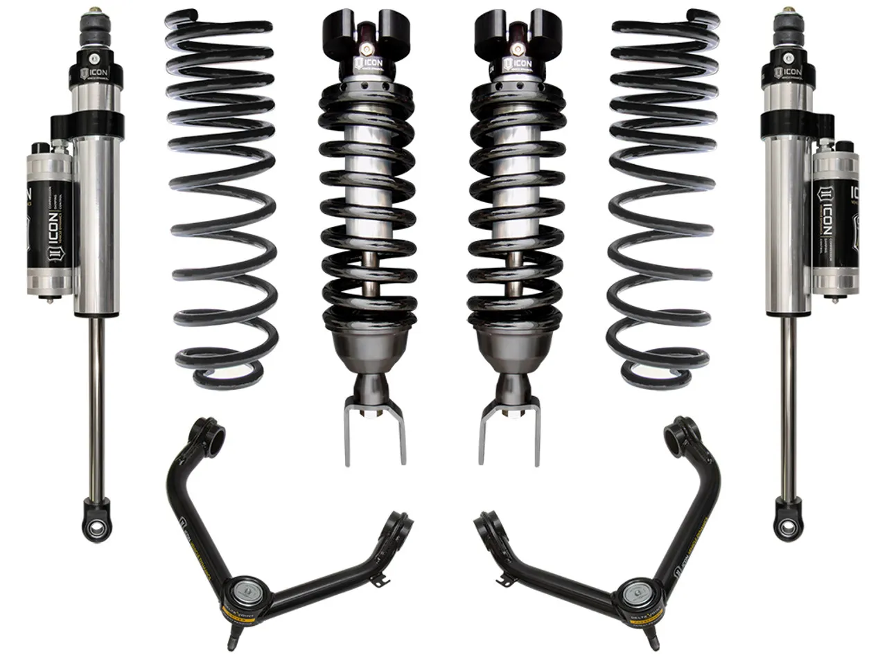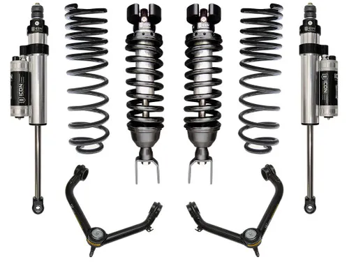 This system features upper control arms with ICON's patented Delta Joint. The Delta Joint is a heavy-duty high angle ball joint that combines the durability of a ball joint with the performance characteristics of a traditional uniball. While the industry standard uniball does a great job of allowing the control arms of a vehicle to articulate with little bind, they do have an inherent weakness that leaves more to be desired when used in a daily driven application - exposure to the elements. The Delta Joint features a zinc plated housing providing the first layer of corrosion resistance, while a tough grease seal keeps potentially harmful elements out of the inner workings of the joint. Metal on metal construction and a greaseable design increase the longevity of the Delta Joint while at the same time allowing for noise-free operation. What makes the Delta Joint unique is that it brings the best of both worlds to ICON upper control arms with features that make it more robust than a uniball, and at the same time capable of greater angularity than a typical ball joint.