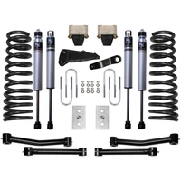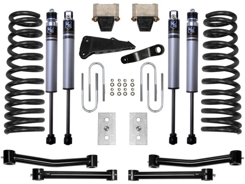 2009-2012 Ram 2500/3500 4.5" Stage 1 Suspension System utilizes the same technology as the 2.5" systems while adding lift height and ground clearance. Additional engineered front end components are added to ensure proper steering geometry with improved function throughout the entire travel range whether on or off road. The Stage 1 System is comprised of dual rate coil springs, tubular steel upper & lower link arms, polyurethane bumpstops w/ billet extension, sway bar drop brackets, forged pitman arm, track bar drop bracket, rear 2.5" lift blocks with u-bolts, and 2.0 Aluminum Series smooth body shocks. ICON steel upper & lower links increase performance, strength, and range of alignment. These link arms decrease the bind found in the factory link bushings. This entry level system with billet link arms is great for towing, rough construction site terrains, and country dirt roads all while keeping a smooth highway feel. Installing this kit allows proper clearance for 35" tall tires with no modifications, and some 37" tires with minor fender well trimming for clearance. With the endless hours ICON has spent testing and tuning our suspension components and shocks together, you can rest assured you have the best suspension solution on the market.