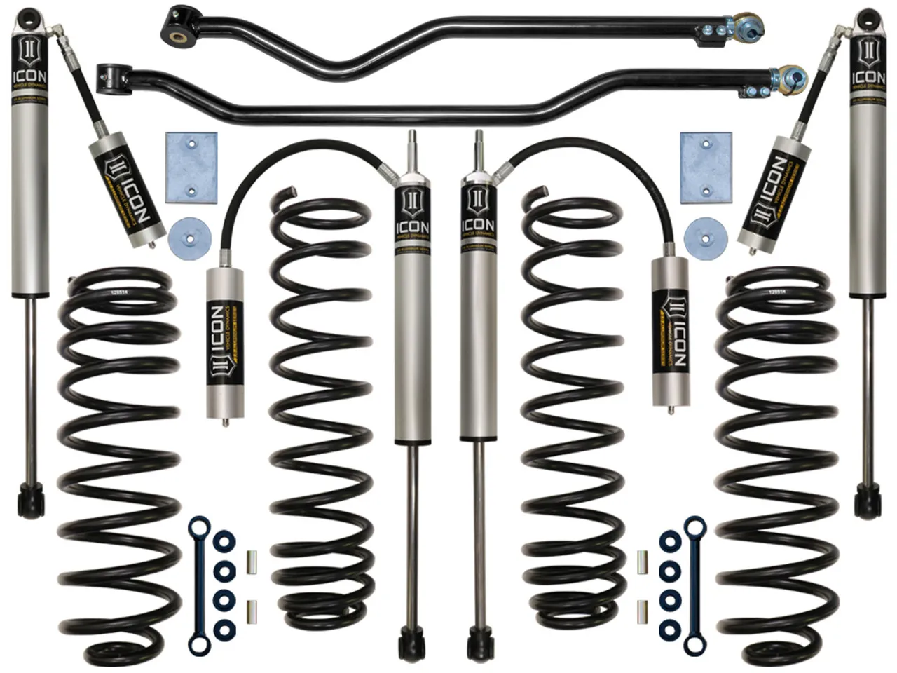 The ICON Vehicle Dynamics 3" Lift Suspension System is designed for Jeep JK owner's demanding the ultimate in performance and ride quality, without the larger stance you find in bigger lift systems on today's market. ICON's Jeep Wrangler JK 3" lift system is engineered with front and rear dual rate progressive wound springs which is the foundation for on and off-road performance and suspension articulation. The dual rate design gives you a softer initial rate for superb on road comfort and a firmer than stock secondary rate that increases during compression for excellent bottom out control. ICON V.S. 2.0 Aluminum Series Remote Reservoir shocks add the finishing touch with OE mounting, aircraft grade components, and vehicle specific valving. Remote Reservoir shocks are great for additional heat dissipation to prevent shock fade during off road use. Together the combination of ICON dual rate coils and V.S. 2.0 Aluminum Series shocks adds 30% more wheel travel over stock, helping you rock crawl safer or soak up larger terrain at higher speeds keeping those wheels on the ground. In this Stage 3 system adjustable track bars are included front and rear for optimizing axle position to ensure your axles are perfectly centered under the vehicle. This ICON 3" JK lift system is designed from the ground up to give the Jeep Wrangler JK's the best performance, suspension handling / ride quality, and clearance for 33" tall tires (35" tall with installation of aftermarket high-clearance fenders).