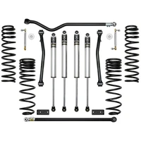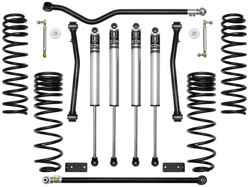 The Stage 4 ICON 2.5 Suspension System for the Jeep Gladiator is the ideal setup for drastically improving on-road ride quality and overall performance for the daily driven application that will see frequent, moderate off-road use. This complete suspension system features 2.0 Aluminum Series shocks, 2.5 lift dual-rate front coil springs, a tubular steel fixed front lower link kit, billet front sway bar links, a triple-rate rear coil spring kit, a rear sway bar relocation kit, front and rear adjustable track bars, and all necessary hardware for install. This system provides an increase of over 30% front and 20% rear wheel travel and was designed around the use of a 35 tire. For those looking to run a 37 tire this can be achieved with the ICON Jeep JT Bump Stop Spacer Kit (Part #22071).