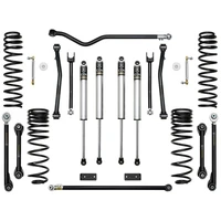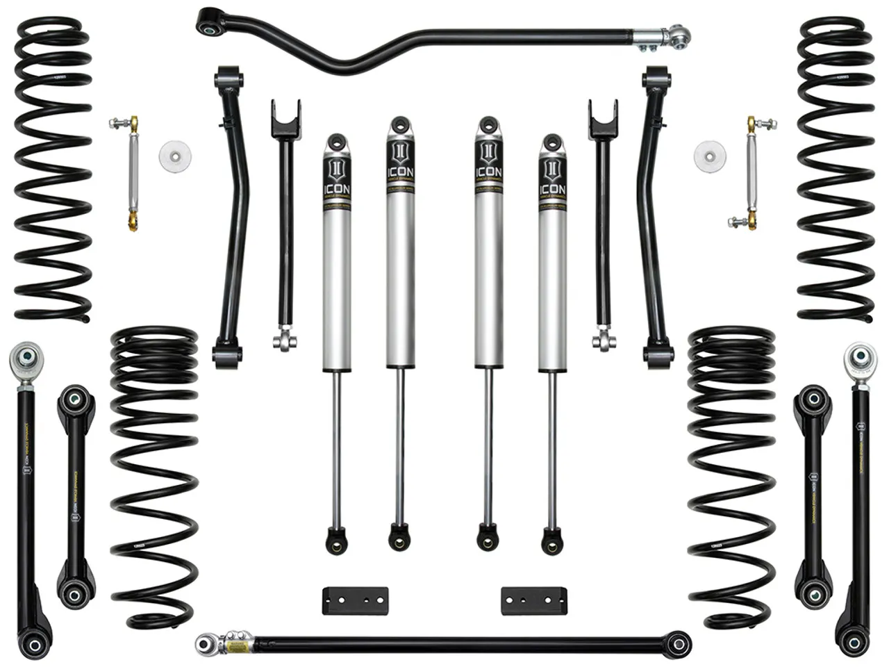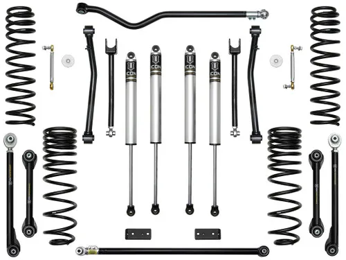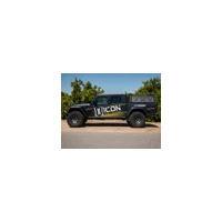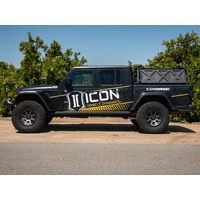 The Stage 5 ICON 2.5 Suspension System for the Jeep Gladiator is the ideal setup for significantly improving off-road performance and overall ride quality for the application that will see frequent moderate off-road use. This complete suspension system features 2.0 Aluminum Series shocks, 2.5 lift dual-rate front coil springs, tubular steel fixed lower and adjustable upper front links, billet front sway bar links, a triple-rate rear coil spring kit, tubular steel fixed upper and adjustable lower rear links, a rear sway bar relocation kit, front and rear adjustable track bars, and all necessary hardware for install. This system provides an increase of over 30% front and 20% rear wheel travel and was designed around the use of a 35 tire. For those looking to run a 37 tire this can be achieved with the ICON Jeep JT Bump Stop Spacer Kit (Part #22071).