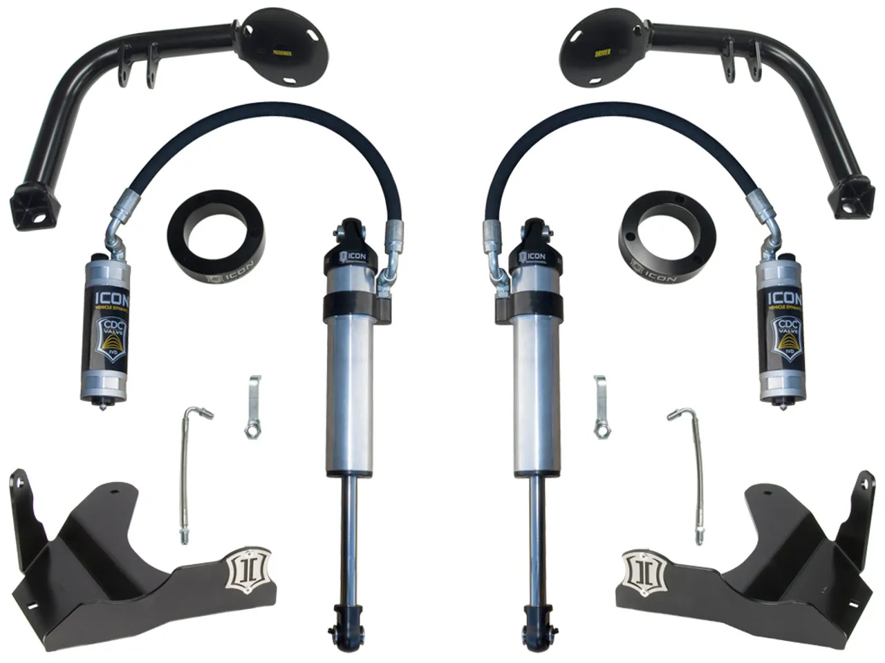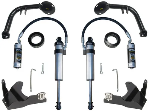 The S2 Secondary Shock System utilizes the factory lower control arms and maintains OE track width while a combination of a billet aluminum shock tower adapters, fabricated shock hoops, and steel skid plates (with incorporated shock mounts) make for a straightforward install with the exceptional build quality you would expect from an ICON Vehicle Dynamics product. The system was designed to eliminate the need for any major alteration of the vehicles frame or any other factory suspension components, and the components are 100% removable in case the system is to be installed on another vehicle. The modular design of the S2 kit also allows for standalone installation of the skid plates, which provides the added benefit of protecting the factory lower control arms from potential trail damage that can be experienced while off-road.