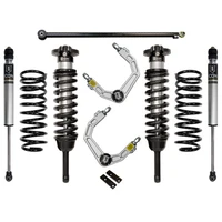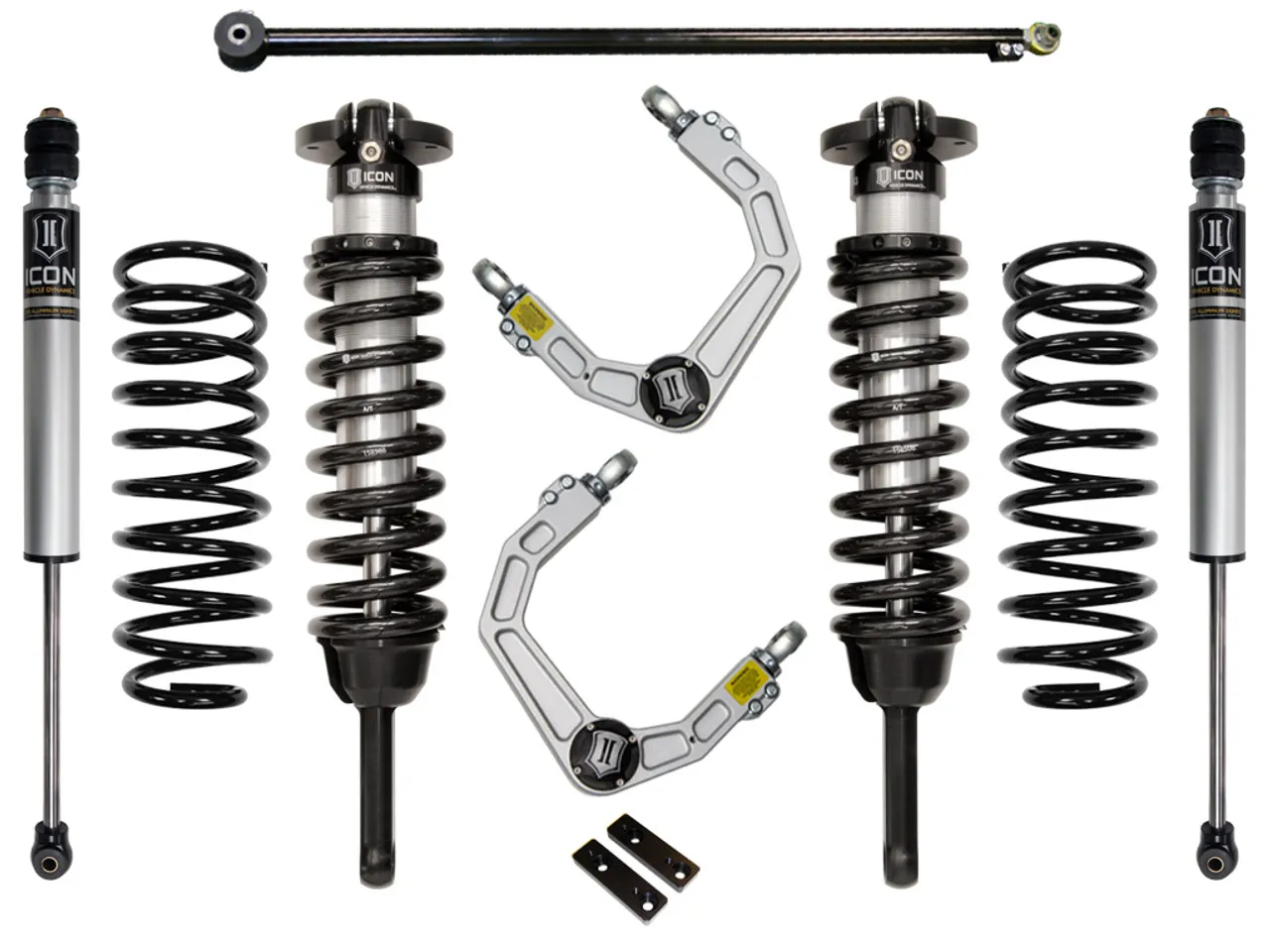 This system features upper control arms with ICON's patented Delta Joint. The Delta Joint is a heavy-duty high angle ball joint that combines the durability of a ball joint with the performance characteristics of a traditional uniball. While the industry standard uniball does a great job of allowing the control arms of a vehicle to articulate with little bind, they do have an inherent weakness that leaves more to be desired when used in a daily driven application - exposure to the elements. The Delta Joint features a zinc plated housing providing the first layer of corrosion resistance, while a tough grease seal keeps potentially harmful elements out of the inner workings of the joint. Metal on metal construction and a greaseable design increase the longevity of the Delta Joint while at the same time allowing for noise-free operation. What makes the Delta Joint unique is that it brings the best of both worlds to ICON upper control arms with features that make it more robust than a uniball, and at the same time capable of greater angularity than a typical ball joint.