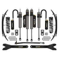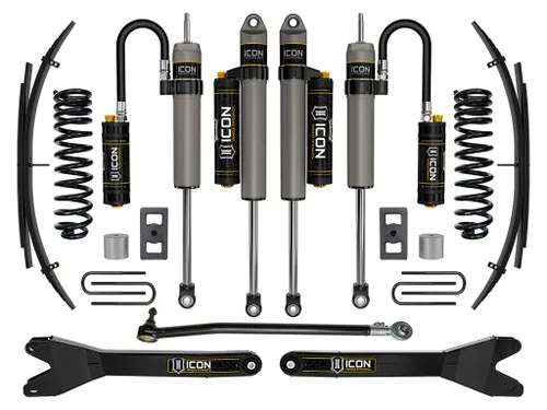 This ICON Vehicle Dynamics 2.5 suspension system is a great way to lift your 4WD 2023 Ford F-250/F-350 Super Duty while drastically improving ride quality and performance. The Stage 4 system is perfect for on-road and off-road use including towing, job site duty and general off-road adventure. Also included in this stage is ICON's CDC Valve front and rear shocks, for those desiring an easy way to tune the ride externally with 10 settings, from soft to hard. ICON's Stage 4 System is comprised of dual rate coil springs, fabricated radius arms, on-vehicle adjustable front track bar, rear leaf spring expansion packs with blocks and U-bolts for a more compliant ride and reduced axle wrap, and ICON 2.5 Aluminum Series CDCV remote reservoir front and CDCV piggyback reservoir rear shocks. This stage sees the inclusion of the ICON Vehicle Dynamics Ford Super Duty Radius Arm System that feature a sealed pivot bushing that minimizes road feedback and ensures a long life and quiet operation. Additionally, their fabricated, fully boxed design ensures strength and utilizes a profile optimized for tire clearance at full steering lock, making a 37 tall tire clear without coming in contact with the radius arm. With the endless hours ICON has spent testing and tuning our suspension components and shocks as a complete package, you can rest assured you have the best suspension solution on the market.