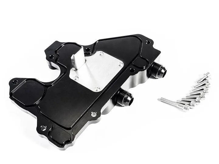 In order to keep the factory breather system fully functional, we have designed a billet breather plate with a complex baffle system, which works effectively to keep oil out of the lines, while still allowing the crankcase to breathe through the catch can. This plate directly replaces the PCV valve on the top side of the valve cover, with all necessary provisions for the OEM hoses that connect to it.