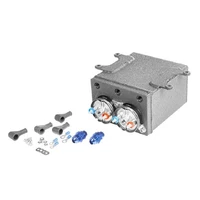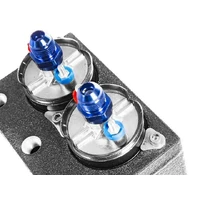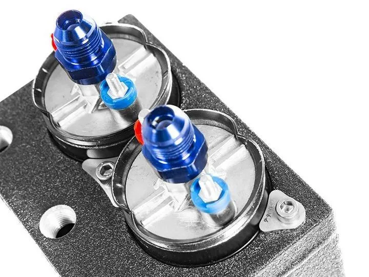 The pumps are O-ring sealed and securely clamped into place using an in-house machined top plate. To provide a leak-proof supply of fuel to the surge tank three -6AN o-ring boss inputs/outputs have been machined to the top plate. The -6 o-ring boss inputs/outputs can be customized for a large variety of fuel fittings such as AN bends, AN straights, stainless hose connections, push lock hose, braided lines, hard lines, and more. The back of the machined top plate has been fully pocketed out to remove excess weight. The fuel pump is secured to the top plate with stainless brackets and hardware providing reliable operation.