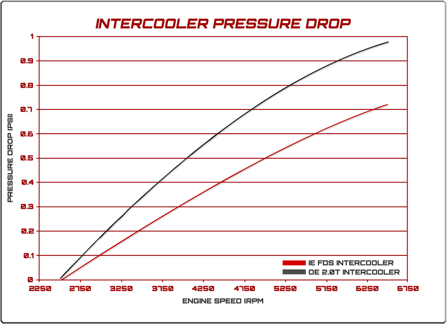 Along with lower intake air temperatures, the large core within the IE intercooler also decreases pressure drop when compared to the factory unit. Simply put, pressure drop is the amount of pressure that is lost as air travels through the intercooler. As boost pressure is raised, pressure drop typically begins to climb. By using a larger core that flows much more freely than the factory core, pressure drop is reduced, reducing the need for the turbocharger to work harder to produce the required boost levels.