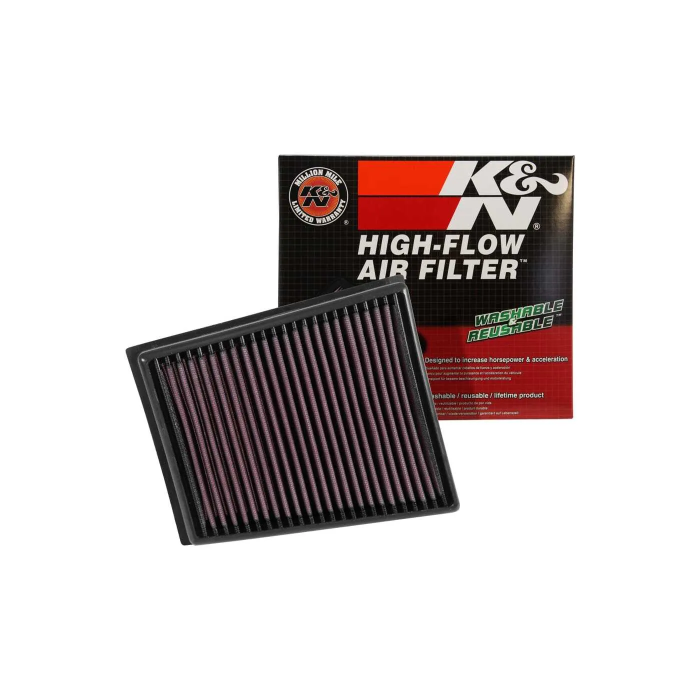 K&N® washable, reusable High-Flow Air Filters™ feature a state-of-the-art design of layered, oiled cotton media engineered to improve airflow and capture contaminants, and are designed to provide an increase in horsepower. Each performance air filter is reusable, engineered to last for the entire lifespan of your vehicle, and backed by K&N’s 10-Year/Million Mile Limited Warranty. K&N drop-in replacement filters are designed to install easily into your factory air box. Upgrade today and start enjoying superior airflow and superior performance from K&N’s most popular product!