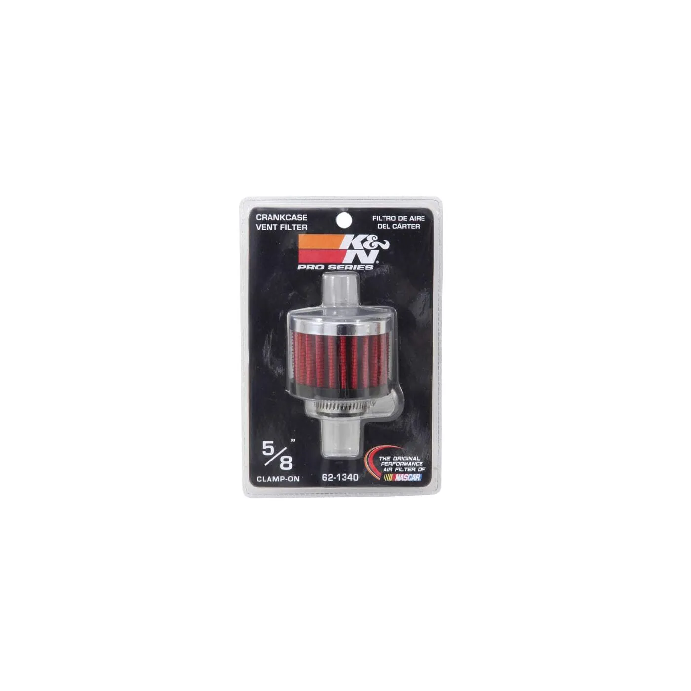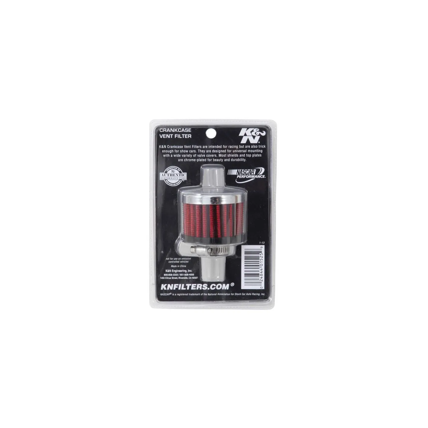 K&N crankcase vent filters are perfect for racing applications, vintage cars or individuals who want to add some aesthetics to their classic carbureted engine. The 62-1340 crankcase vent filter has a K&N embossed chrome-plated steel top with a black rubber base. The 5/8 inch diameter zinc tube is designed to push in and clamp directly on to metal or plastic tubing where venting is needed. Constructed with a synthetic filter media it can be cleaned and reused repeatedly. Note: Legal in California only for racing vehicles which may never be used, registered, or licensed for use upon a highway. See knfilters.com for CARB status on each part for a specific vehicle.