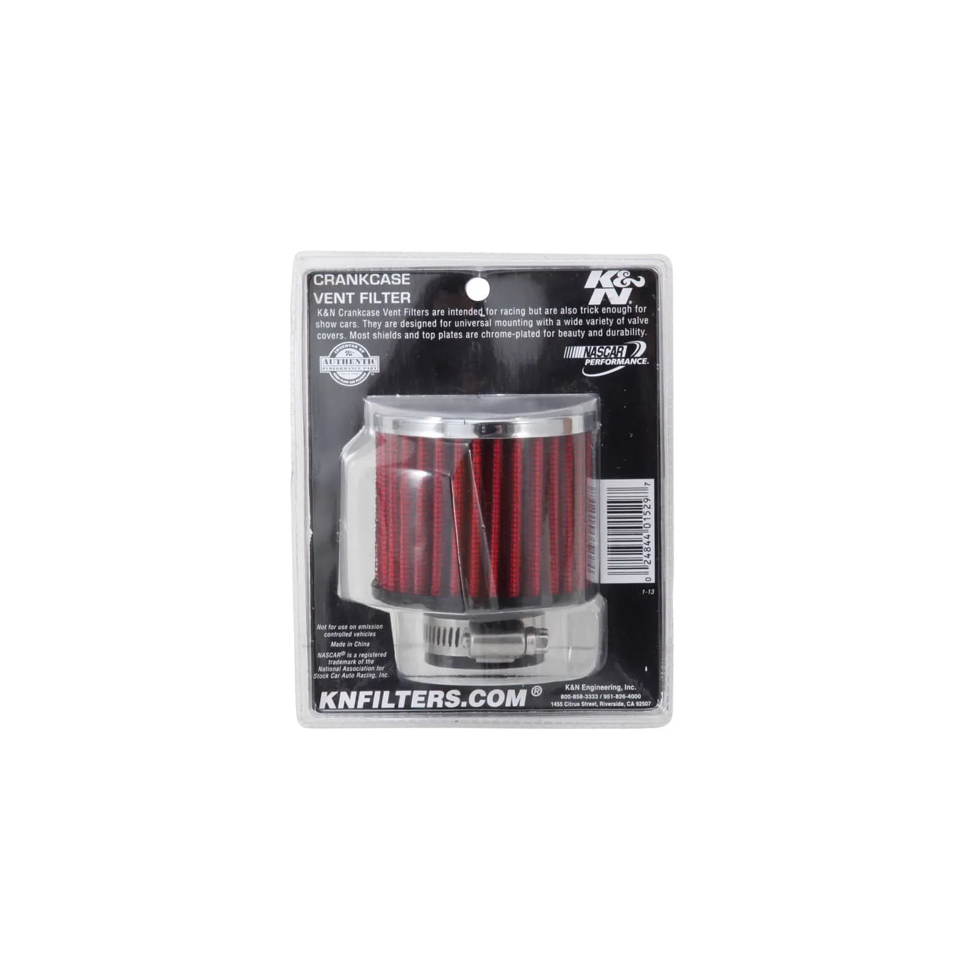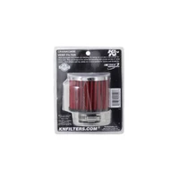 K&N crankcase vent filters are perfect for racing applications, vintage cars or individuals who want to add some aesthetics to their classic carbureted engine. The 62-1390 crankcase vent filter has a K&N embossed chrome-plated steel top with a black rubber base. The filter is 2-1/2 inches tall, 3 inches in outside diameter with a 1-1/4 inch flange which is designed to push on to the existing rubber breather grommets. This air filter is constructed with non-woven synthetic filter media so it can be cleaned and reused repeatedly. Note: Legal in California only for racing vehicles which may never be used, registered, or licensed for use upon a highway. See knfilters.com for CARB status on each part for a specific vehicle.
