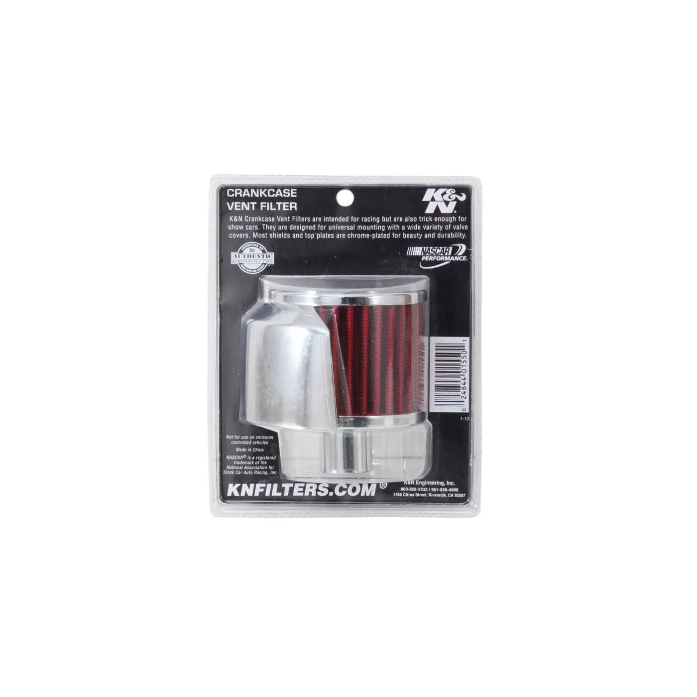 K&N crankcase vent filters are perfect for racing applications, vintage cars or individuals who want to add some aesthetics to their classic carbureted engine. The 62-1520 crankcase vent filter has a K&N embossed chrome top, steel base and comes with a deflector shield to protect against engine heat. The 1 inch diameter steel tube is designed to push in and clamp directly on to rubber or plastic tubing where venting is needed. This air filter is constructed with non-woven synthetic filter media so it can be cleaned and reused repeatedly. Note: Legal in California only for racing vehicles which may never be used, registered, or licensed for use upon a highway. See knfilters.com for CARB status on each part for a specific vehicle.
