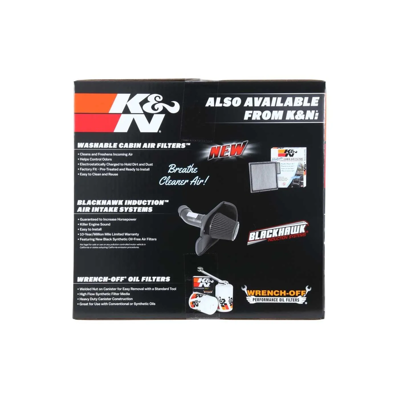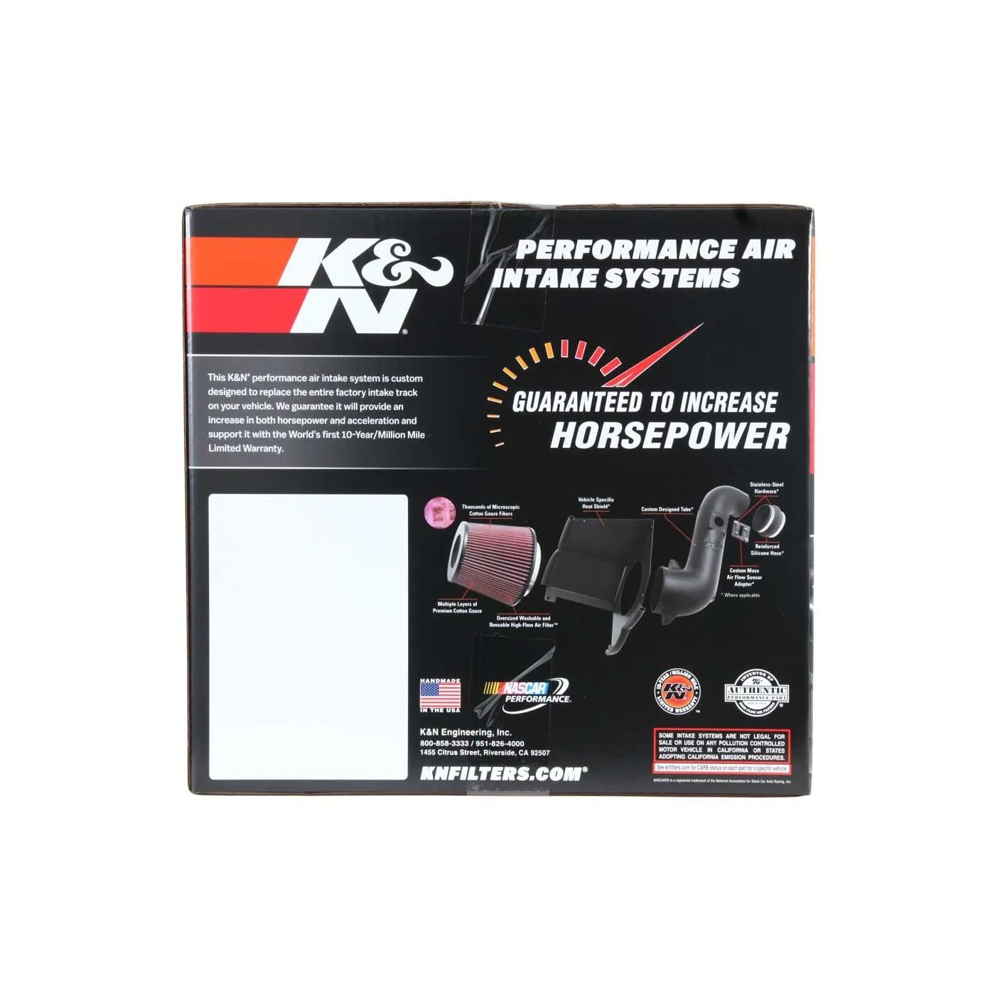 Gain a guaranteed increase in horsepower and torque with a K&N® cold air intake system featuring a mandrel-bent aluminum intake tube. Each system is paired with a washable, reusable High-Flow Air Filter™ featuring oiled cotton filter media. The oversized, conical filter design allows you to go up to 100,000 miles between filter services under normal highway driving conditions. A custom heat shield or air box helps protect intake air from the high temperature of your engine bay, and the entire system can typically be installed in less than 90 minutes. Some intakes are not legal for sale or use on any pollution controlled motor vehicle in California. See the product specifications for CARB status on each part for a specific vehicle.