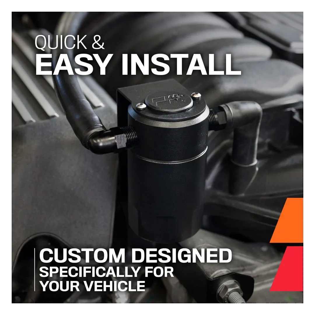The K&N® Air Oil Separator protects the engine and intake tract from blowby by capturing the oil in our industry leading high capacity reservoir. This helps prevent power loss and possible engine damage caused by blowby. The K&N Air Oil Separator is quick and easy to install in about 30 minutes with basic tools and uses factory-style hose connections to quickly snap on and off. The oil separator replaces the factory line from the crank case allowing the oil separator to be mounted to a coinvent location in your engine bay. No tools are needed to check and empty the oil collector reservoir. Each unit is engineered specifically for your vehicle and is backed by our No-Hassle Lifetime Limited Warranty.