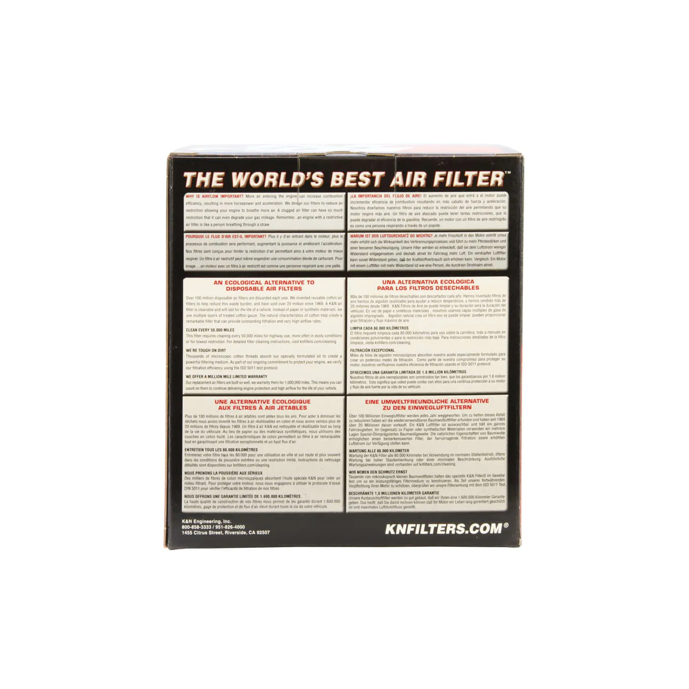 K&N® washable, reusable High-Flow Air Filters™ feature a state-of-the-art design of layered, oiled cotton media engineered to improve airflow and capture contaminants, and are designed to provide an increase in horsepower. Each performance air filter is reusable, engineered to last for the entire lifespan of your vehicle, and backed by K&N’s 10-Year/Million Mile Limited Warranty. K&N drop-in replacement filters are designed to install easily into your factory air box. Upgrade today and start enjoying superior airflow and superior performance from K&N’s most popular product!