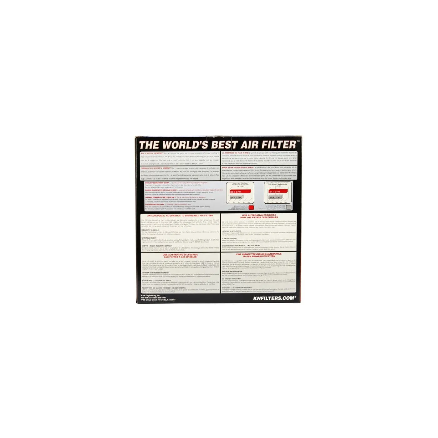 K&N® washable, reusable High-Flow Air Filters™ feature a state-of-the-art design of layered, oiled cotton media engineered to improve airflow and capture contaminants, and are designed to provide an increase in horsepower. Each performance air filter is reusable, engineered to last for the entire lifespan of your vehicle, and backed by K&N’s 10-Year/Million Mile Limited Warranty. K&N drop-in replacement filters are designed to install easily into your factory air box. Upgrade today and start enjoying superior airflow and superior performance from K&N’s most popular product!