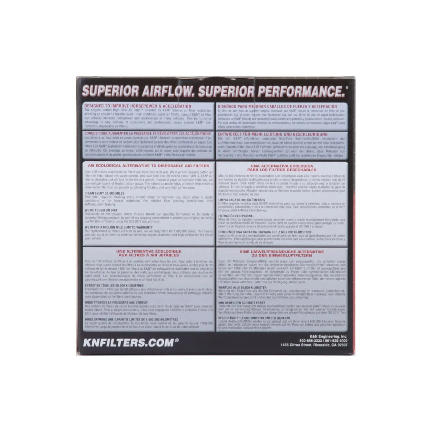K&N® washable, reusable High-Flow Air Filters™ feature a state-of-the-art design of layered, oiled cotton media engineered to improve airflow and capture contaminants, and are designed to provide an increase in horsepower. Each performance air filter is reusable, engineered to last for the entire lifespan of your vehicle, and backed by K&N’s 10-Year/Million Mile Limited Warranty. K&N drop-in replacement filters are designed to install easily into your factory air box. Upgrade today and start enjoying superior airflow and superior performance from K&N’s most popular product!