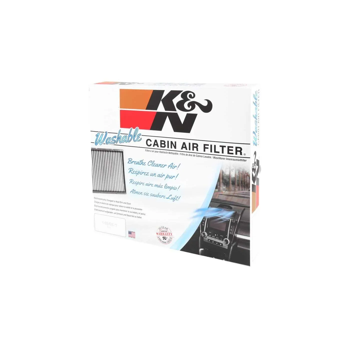 K&N® washable cabin air filters are engineered to fit directly into your factory air box, offering excellent protection from environmental contaminants and odor-causing particles. The thermally bonded high-flow synthetic material acts as a physical barrier, helping trap dust, pollen, mold, bacteria, fungi, and other pollutants, and is specially pleated to increase the contaminant-capturing surface area. Each filter is engineered to install easily into your factory cabin air box, and is designed to be easily washed and reinstalled whenever necessary. Buy with confidence under the K&N® 10-Year/Million Mile Limited Warranty™.
