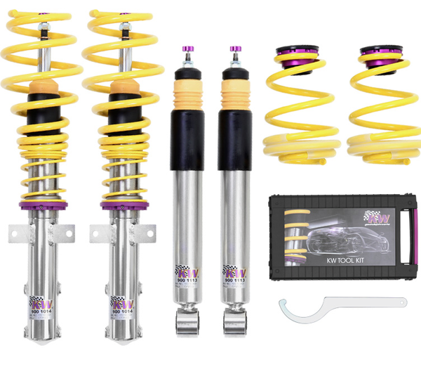 Drivers who want more than just an outstanding look and lowering within the tested adjustment range, will find the perfect suspension solution with our KW coilovers Variant 2 "inox-line". Not only stainless steel struts, corrosion-resistant components great durability, you have the possiblity to adjust the dampers to your own requirements in rebound (16 clicks) are good reasons to buy KW coilovers Variant 2 "inox-line".