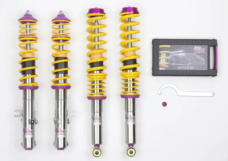 The KW coilover kit Variant 3 inox-line is the perfect accessory for performance-oriented drivers and tuning enthusiasts who put a great demand on their suspension. The separately rebound and compression damping adjustable dampers with their well-thought-through click adjustment allow a perfect setup. So it is easy to influence the steering behaviour, directional stability, tire grip and handling characteristics when driving on the limit.