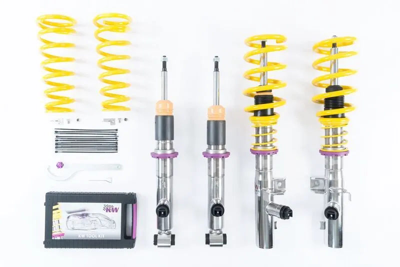 Our suspension technology is compatible with the electronics of various automobile manufacturers. The adaptive KW DDC Plug & Play coilover kit is recognized by the factory onboard electronics. All displays and control elements of your vehicle remain fully functional with the advantages of adaptive damping. The stainless steel construction provides additional protection and durability against the elements, salt and dirt. Height adjustability is retained from our unique use of materials for construction.