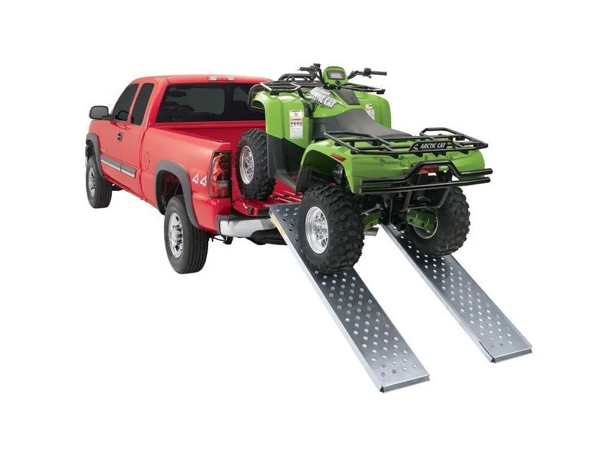 Lund's Bi-Fold Loading Ramp has an extruded hole surface that provides traction, easy loading and accommodates all wheel sizes. The nylon safety straps secure ramps to vehicle to prevent shifting, and the angled foot provides smooth transition from ground to ramp. This Bi-fold ramp is constructed of aluminum for lightweight durability and is rust resistant.
