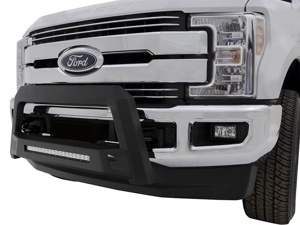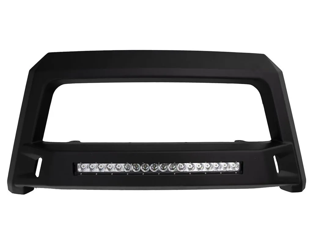 Upgrade your truck's front-end with a LUND Revolution bull bar! Adding endless style and ultimate protection, these grille guards are the final revolution. They're crafted from heavy-gauge stamped steel and finished in a textured, matte-black powdercoat to withstand the elements. Revolution bull bars implement a simple, no-drill installation, and their rugged styling features an integrated off-road LED light bar to illuminate even the darkest of back roads. Whether your truck has aggressive lines or more refined curves, LUND Revolution bull bars deliver extra front-end protection with their leading edge, chiseled multi-dimensional design. Order the model recommended for your truck.