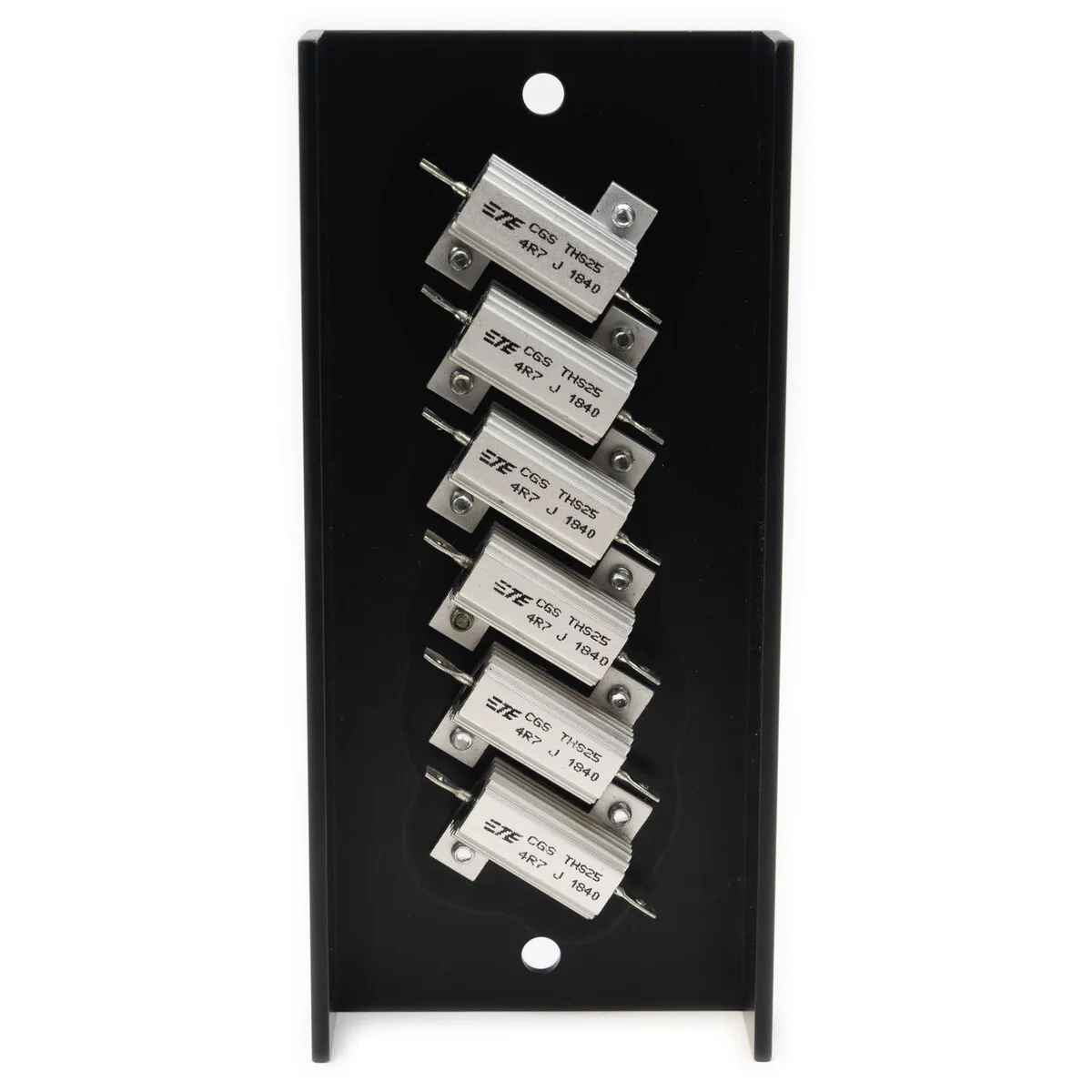 For use with low-impedance injectors. Compatible with injectors with impedance between 2 and 6 Ohms. Please contact us if you are planning on using injectors with an impedance of less than 2 ohms. Includes set of 6 x 4.7ohm 25w resistors mounted to a heatsink. These are also sold in a set of 4. Note that injector ballast resistors get quite hot at high injector duty cycles. These should stay mounted on the supplied heat sink and be bolted to the chassis.