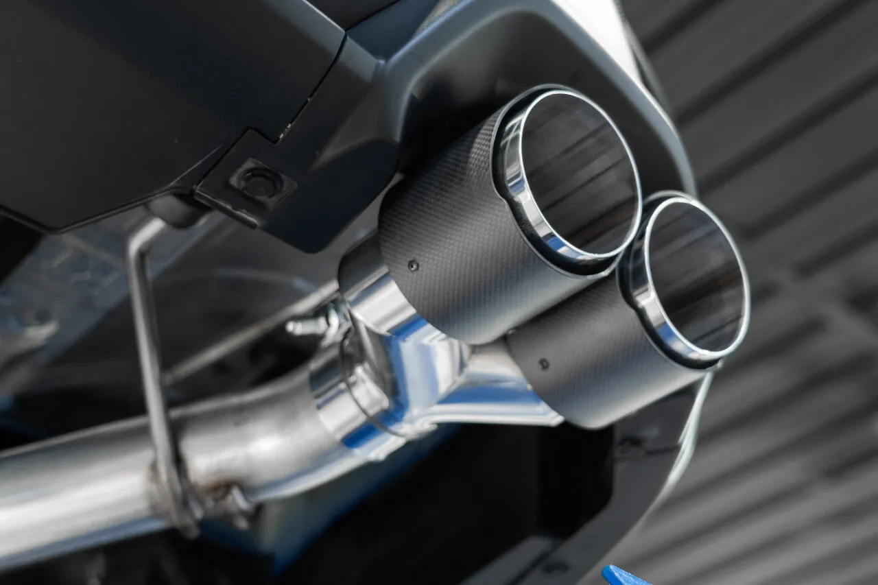 • (2) 4" OD Dual Out Carbon Fiber Tips Included