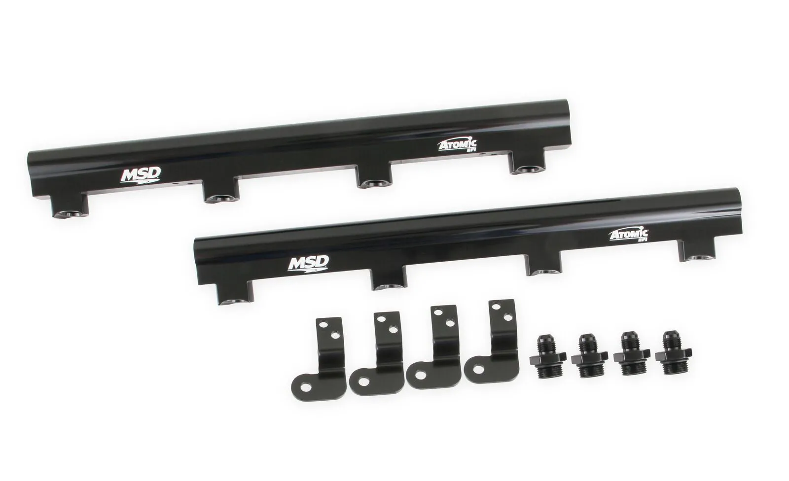 MSD's new Atomic EFI billet fuel rails enhance the great looks of your Atomic AirForce intake manifold._x000D_ _x000D_ Available as rails only, or as complete kits that include all necessary plumbing, these fuel rails are a perfect addition to your engine bay. The bright dip, black anodized finish with laser etched logos will look great for years._x000D_ _x000D_ MSD Atomic fuel rails feature a 5/8" diameter fuel passage that provides the flow capacity necessary to fuel high horsepower applications making them the perfect match for your Atomic AirForce intake manifold.