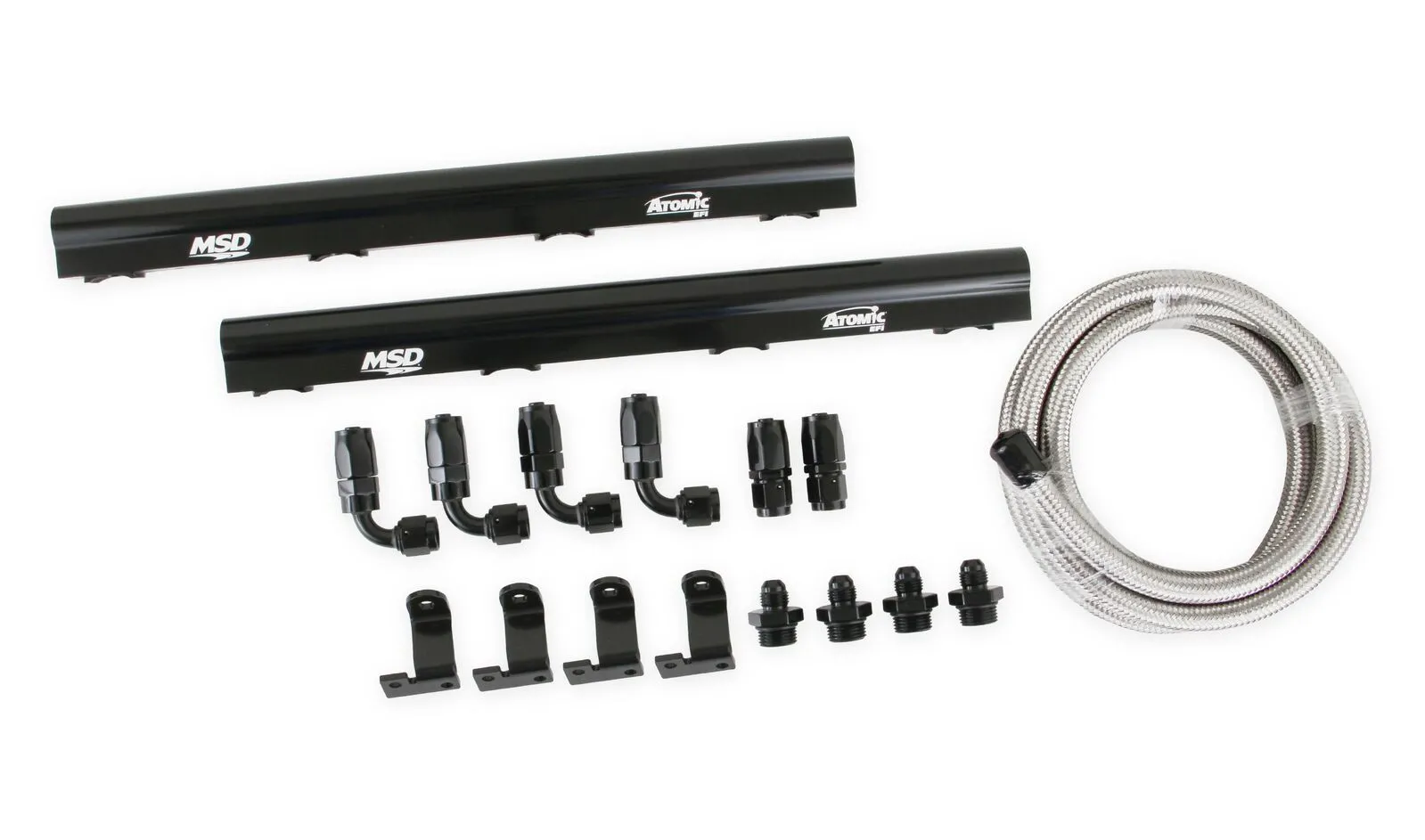 MSD's new Atomic EFI billet fuel rails enhance the great looks of your Atomic AirForce intake manifold._x000D_ _x000D_ Available as rails only, or as complete kits that include all necessary plumbing, these fuel rails are a perfect addition to your engine bay. The bright dip, black anodized finish with laser etched logos will look great for years._x000D_ _x000D_ MSD Atomic fuel rails feature a 5/8" diameter fuel passage that provides the flow capacity necessary to fuel high horsepower applications making them the perfect match for your Atomic AirForce intake manifold.
