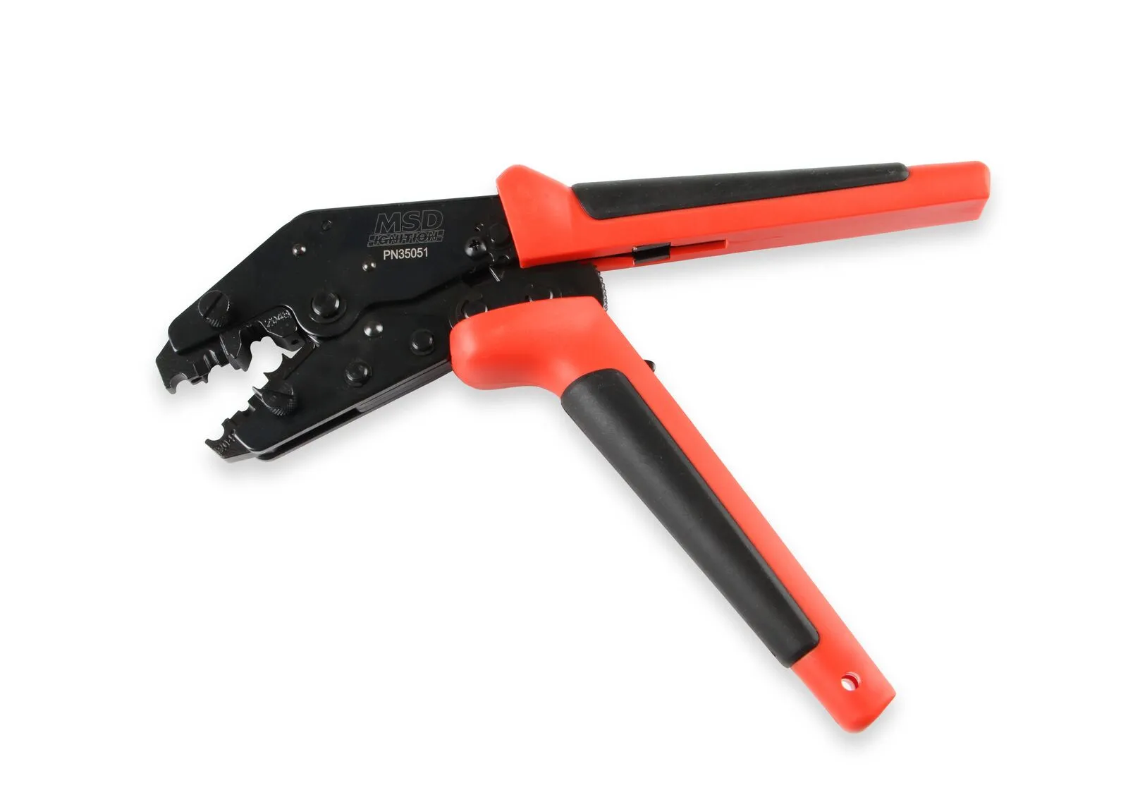 If you frequently make plug wires or do a lot of custom wiring, the Pro-Crimp Tool is a must for your toolbox. The Pro-Crimp features a hardened steel frame with comfortable molded hand grips. The slick ratchet action provides secure, factory quality crimps every time. The Tool is supplied with precision crimping/stripping jaws for MSD's spark plug wire terminals.