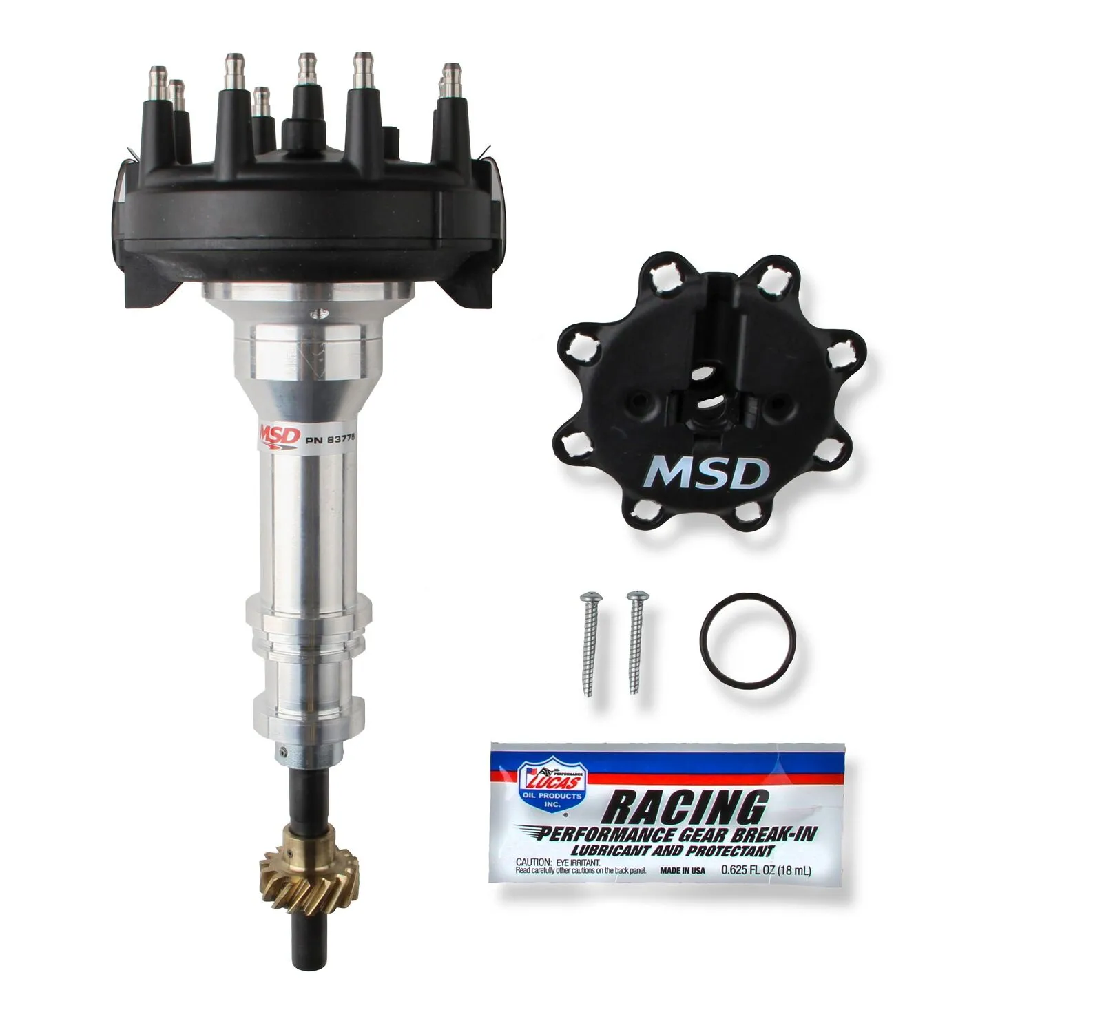 These distributors have a low-profile cap assembly to clear busy intake set-ups and are topped with MSD's new Rynite-molded Ford-style cap and wire retainer. The low design is accomplished because the only thing under the cap is a rotor! These distributors don't have an advance assembly or pick-up so they must be used with a Crank Trigger. Since these distributors are designed for racing applications, a ball bearing is pressed into the housing to guide the polished steel shaft. Each distributor is supplied with a bronze gear.
