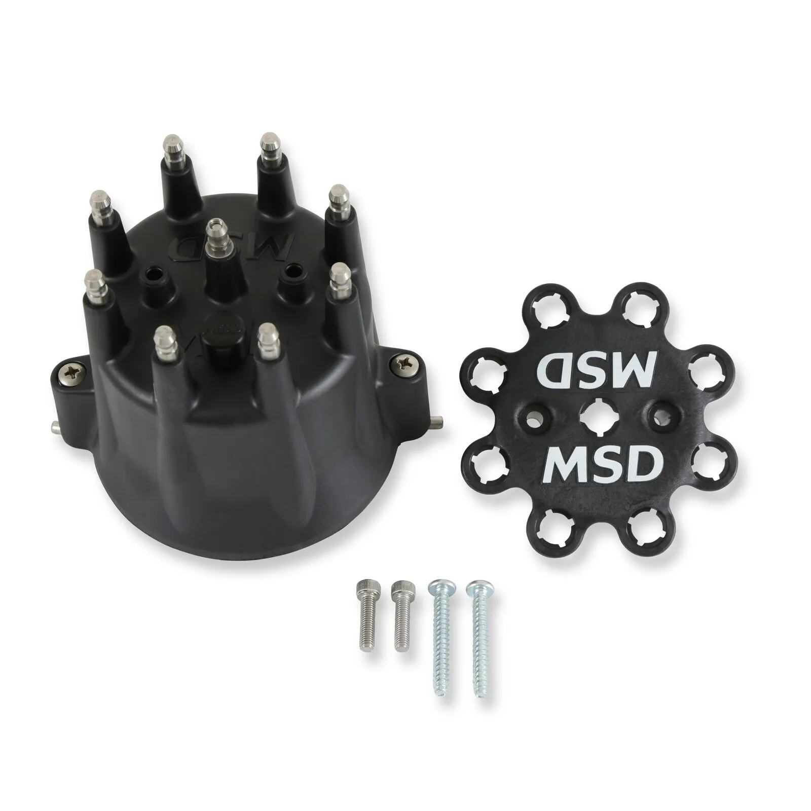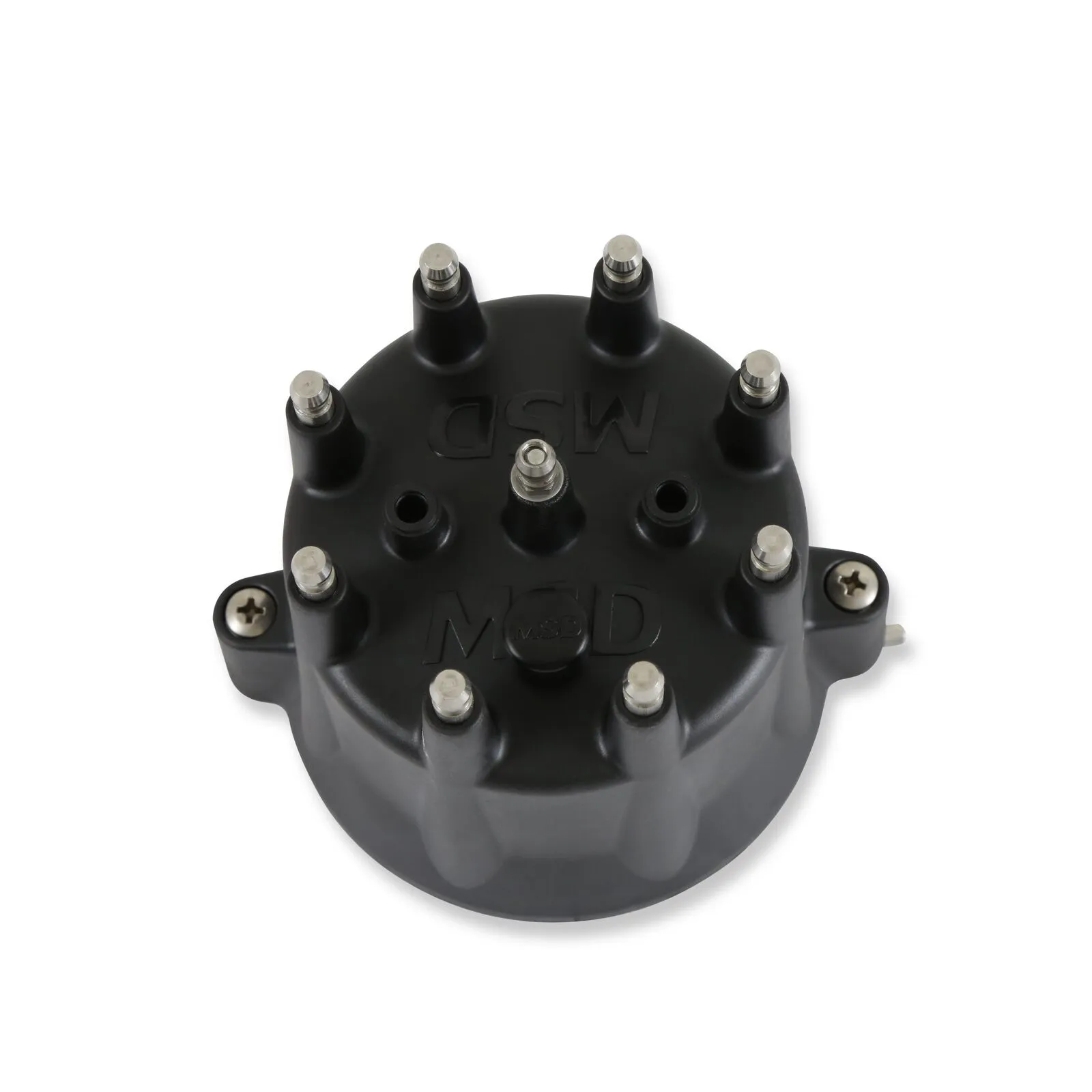 Replacement distributor cap for popular Chevy, Ford and Chrysler MSD distributors. This cap will also fit original GM points distributors.