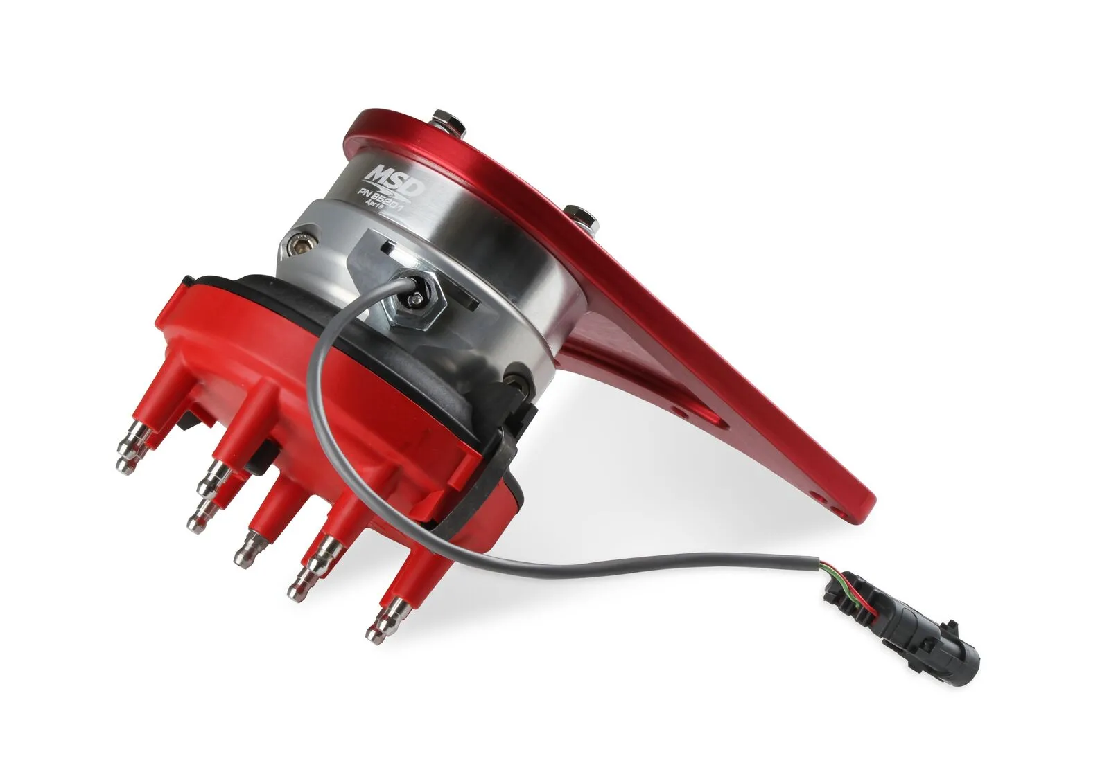 MSD's Pro-Billet Front Drive distributor with adjustable Hall-Effect Sync Pickup is the solution for race engines that don't have room for a standard distributor due to firewall clearance or intake combinations and need a cam sync signal for EFI systems.