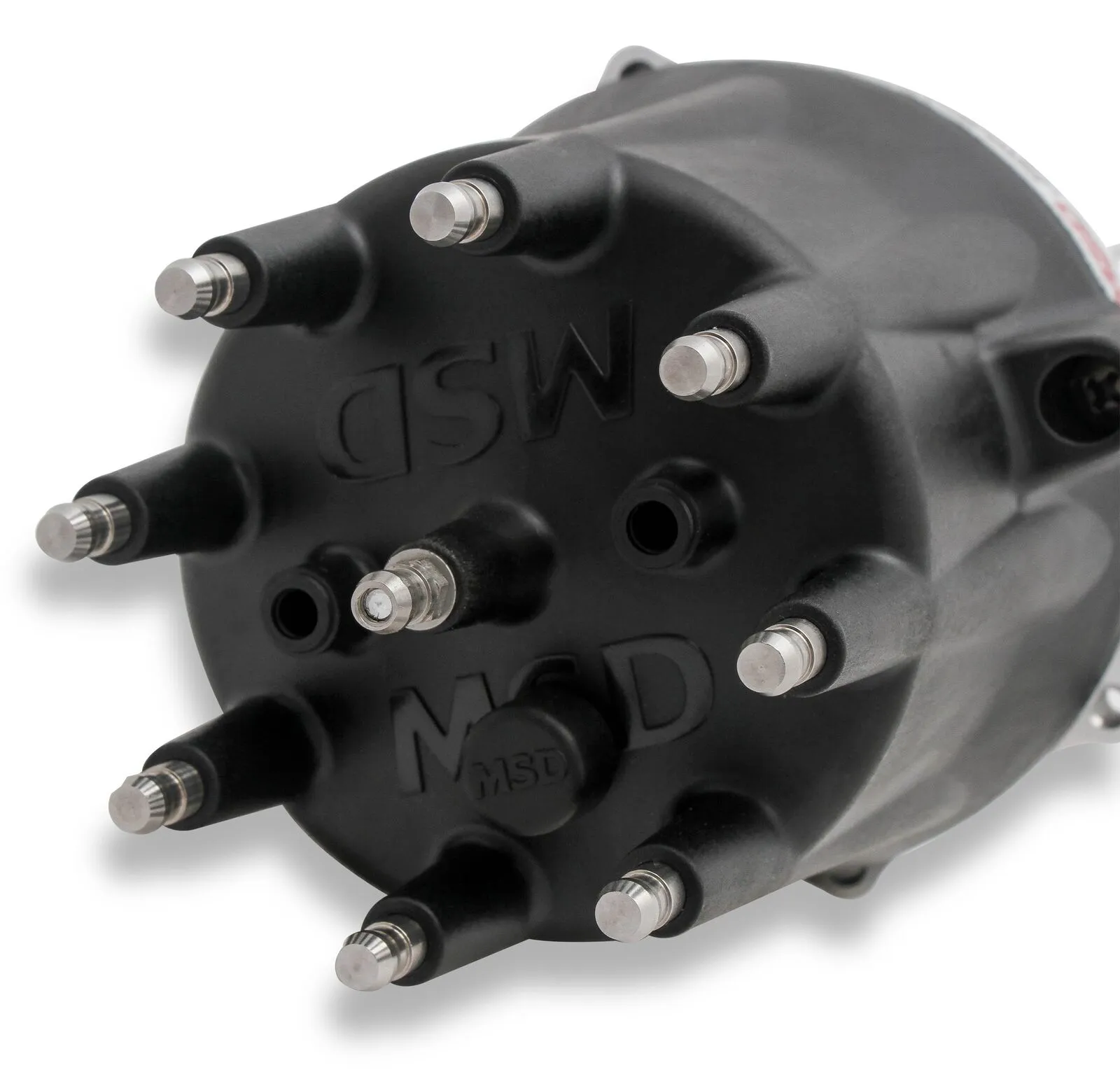 MSD's most popular performance distributor is now available with a black cap that includes 316 Stainless Steel Terminals. The housing is machined from a billet of 6061-T6 aluminum on a state-of-the-art CNC machine producing exact tolerances. For high rpm stability, a .500" steel shaft is supported by a sealed ball bearing and a long sintered bushing. This shaft also receives a QPQ coating for friction reduction and resistance to corrosion. A precision machined reluctor is attached to the shaft which triggers the magnetic pick-up mounted in the housing. This high output magnetic pick-up is the most accurate way to trigger your ignition. Plus, with no moving parts to wear or adjust, the pick-up is maintenancefree! Just above the pick-up is MSD's adjustable mechanical advance assembly.