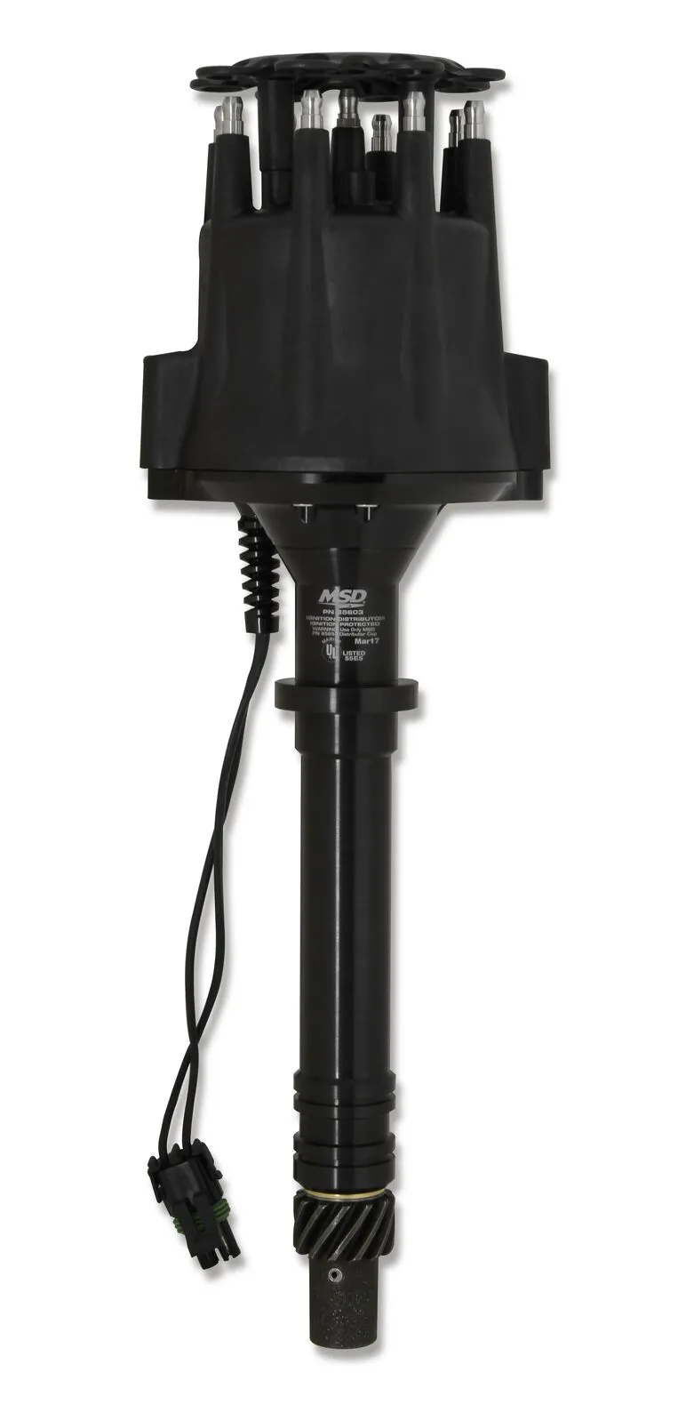 Under the black cap you'll find a quality rotor, pickup, reluctor and adjustable weight plate assembly (where applicable). Chevy applications use a .500" QPQ coated distributor shaft joined by a melonized distributor gear while Ford models run a .531" QPQ coated shaft and cast gear. Both ensure smooth operation, superior strength and long life even when challenged by harsh marine applications.