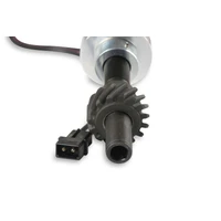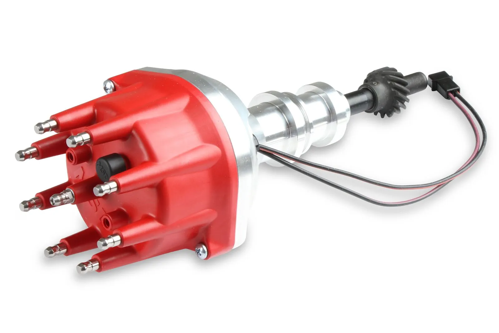 Specifically designed for use with the Holley Ford Hi-Ram carburetor intake manifolds, the Ford distributors are built on the proven foundation of the MSD Pro-Billet distributor line. They rely on MSD's race proven magnetic pickup and precision reluctor to deliver accurate trigger signals to the MSD Ignition throughout RPM range. The reluctor assembly is turned by a hardened steel shaft which rides in a sealed ball bearing for high rpm stability and endurance. Mounted to the top of this shaft is a fully adjustable mechanical advance assembly, and while at the bottom, you have a steel gear for use with hydraulic roller camshafts.