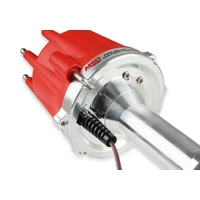 The housing is machined from a billet of 6061-T6 aluminum on a state-of-the-art CNC machine producing exact tolerances. For high rpm stability, a .500" steel shaft is supported by a sealed ball bearing and a long sintered bushing. This shaft also receives a QPQ coating for friction reduction and resistance to corrosion. A precision machined reluctor is attached to the shaft which triggers the magnetic pick-up mounted in the housing. This high output magnetic pick-up is the most accurate way to trigger your ignition. Plus, with no moving parts to wear or adjust, the pick-up is maintenancefree! Just above the pick-up is MSD's adjustable mechanical advance assembly.