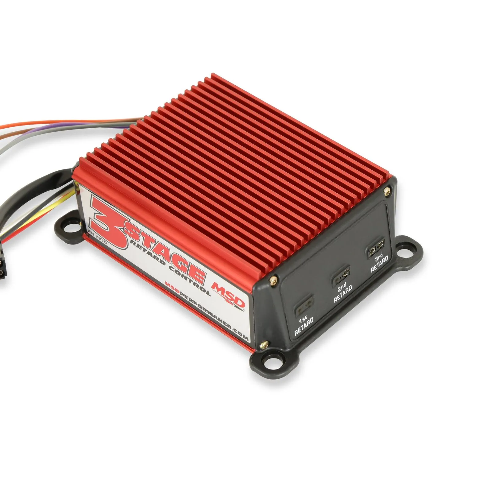The Three Stage Retard Control connects easily to your MSD Ignition and can be triggered from points, electronic ignitions, crank triggers or magnetic pick-up distributors. It is supplied with a 2°, 3° and 4° module and must be used with an MSD 6, SCI, 7, 8 or 10 Series Ignition.