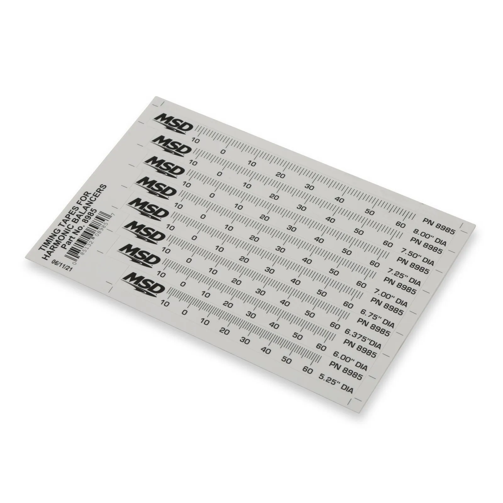 Accurate ignition timing is one of the most vital adjustments you can make to your engine. Proper timing can mean the difference between winning and losing a race or even blowing an engine (as a worst-case scenario). Recognizing the importance of timing, MSD offers these Timing Tapes. The MSD Timing Tape comes with eight different tapes to fit common balancers ranging from 5.25" to 8" in diameter. The tapes are marked off in one-degree increments from 14 degrees ATDC to 64 degrees BTDC and are printed on tough, chemical-resistant material. Not only do the MSD Timing Tapes help you get an exact timing setting, they allow you to see exactly where the Total timing is set. Remember, the Total timing is just as critical as the initial timing and the MSD Timing Tape will help you ensure that it is set accurately.