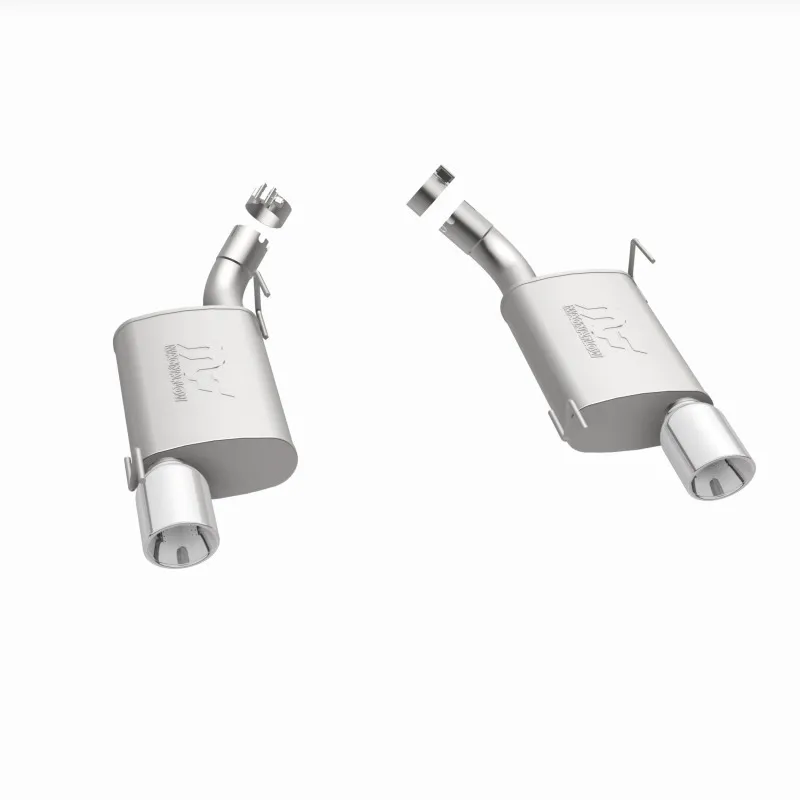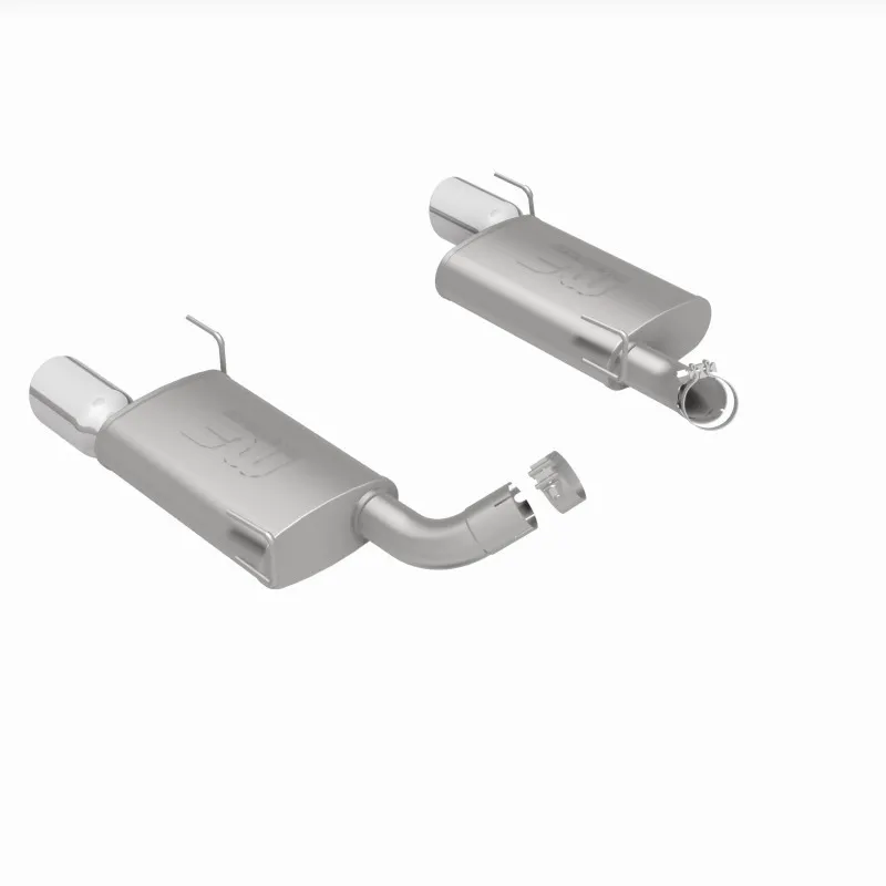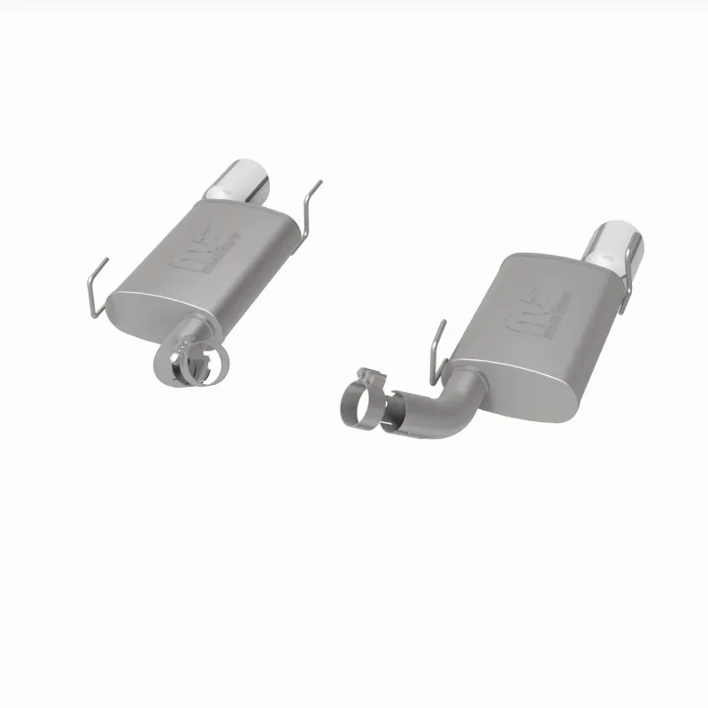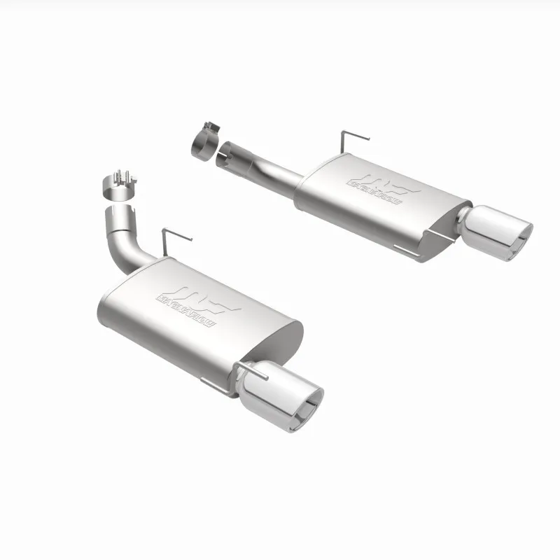 The MagnaFlow 2005-2009 Ford Mustang Street Series Axle-Back Performance Exhaust System 15882 brings enhanced engine sound and dyno-proven performance to your 4.6L, 5.4L 2005-2009 Ford Mustang with a healthy helping of our deep, resonant signature exhaust note at Moderate exterior and Mild interior sound levels. Thanks to its durable, corrosion resistant stainless steel design, this Ford Mustang exhaust system will handle whatever tarmac you decide to leave your mark on. This performance exhaust kit features an axle-back layout designed to replace your Ford Mustang's exhaust system from near the rear axle on back. With its fast-flowing, mandrel bent 2.5in. main piping and 2 Straight-Through mufflers ending in a Dual Split Rear exit with 4in. Polished Welded-On Double Wall Angle Cut Rolled Edge tips, your ride will be sounding as awesome as it looks. Extensive 3D scanning during development has resulted in a direct-fit design that you can easily install yourself. 15882 is produced using CNC precision robotic manufacturing techniques and is backed by MagnaFlow's 1-year limited finish warranty and limited lifetime construction warranty.