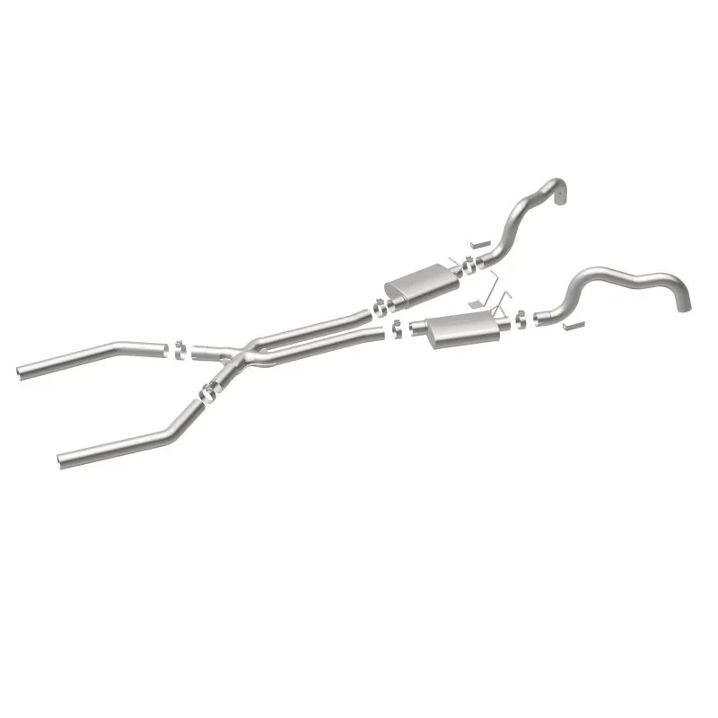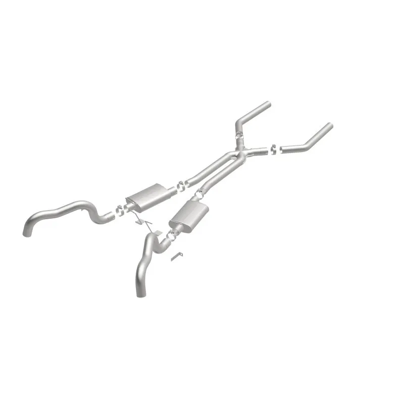 The MagnaFlow Street Series Crossmember-Back Performance Exhaust System 15899 brings enhanced engine sound and dyno-proven performance to your muscle car with a healthy helping of our deep, resonant signature exhaust note at Aggressive exterior and Moderate interior sound levels. Thanks to its durable, corrosion resistant stainless steel design, this exhaust system will handle whatever tarmac you decide to leave your mark on. This performance exhaust kit features a crossmember-back layout designed to replace your exhaust system from the crossmember on back. With its fast-flowing, mandrel bent 3in. main piping and 2 Straight-Through mufflers ending in a Dual Split Rear exit that you can enhance with tips of your choosing, your muscle car will be sounding as awesome as it looks. Extensive 3D scanning during development has resulted in a direct-fit design that you can easily install yourself. 15899 is produced using CNC precision robotic manufacturing techniques and is backed by MagnaFlow's limited lifetime construction warranty.