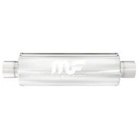 The MagnaFlow 5in. Round Straight-Through Performance Exhaust Muffler 12866 brings our world-famous exhaust sound and dyno-proven performance to your ride in a weight-optimized 5x5x14in. package with a premium satin finish. The straight-through free-flowing design of this round-bodied muffler's reversible, universal 2.5/2.5in. diameter inlet/outlet layout enables versatile installation options to match the spacing requirements of your vehicle. Due to the cutting and welding involved, professional installation is highly recommended. Internally, 12866 utilizes a perforated stainless steel core wrapped in stainless steel mesh and acoustic fiber fill to achieve a powerful, resonant tone. This muffler is made of durable, corrosion resistant stainless steel and produced using cutting-edge CNC precision robotic manufacturing techniques, all backed by MagnaFlow's limited lifetime construction warranty.