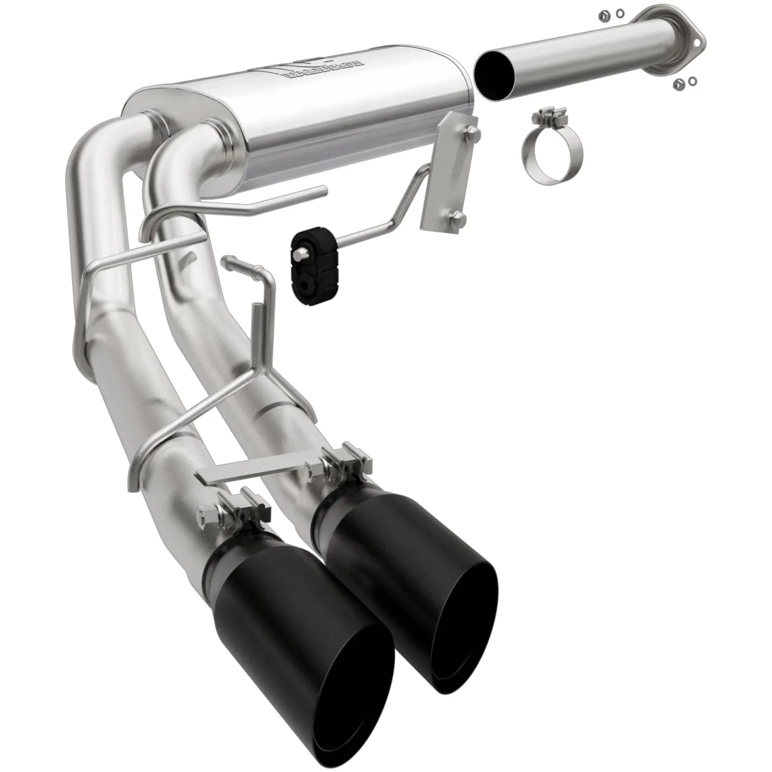 The MagnaFlow 2015-2020 Ford F-150 Street Series Cat-Back Performance Exhaust System 19497 brings out the personality of your 2.7L, 3.5L, 5.0L 2015-2020 Ford F-150 with our signature resonant, powerful engine tone and dyno-proven performance. Thanks to its fast-flowing, mandrel bent 3in. main piping and 1 Straight-Through mufflers ending in a Dual Same Side Before Passenger Rear Tire exit with 3.5in. Black Coated Clamp-On Double Wall Angle Cut Cut Edge tips, this Ford F-150 exhaust kit has the performance chops to match its sporty sound and appearance. Upgrade your ride to the next level with an exhaust that has the pipes to put other Ford F-150's to shame. With this system your vehicle will be producing Very Aggressive exterior and Aggressive interior sound levels while leaving other cars and trucks feeling envious at every stoplight. Exhaust kit 19497 features a cat-back layout that replaces your ride's stock exhaust components from near the catalytic converter on back. Extensive 3D scanning during development has resulted in a direct-fit design that you can easily install yourself. 19497 is produced using CNC precision robotic manufacturing techniques and is backed by MagnaFlow's 1-year limited finish warranty and limited lifetime construction warranty.